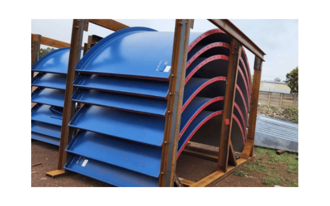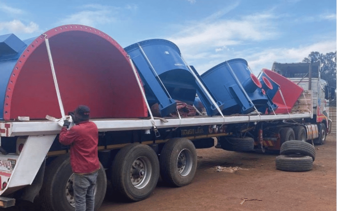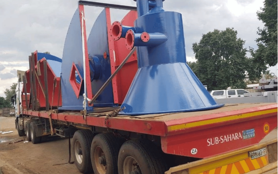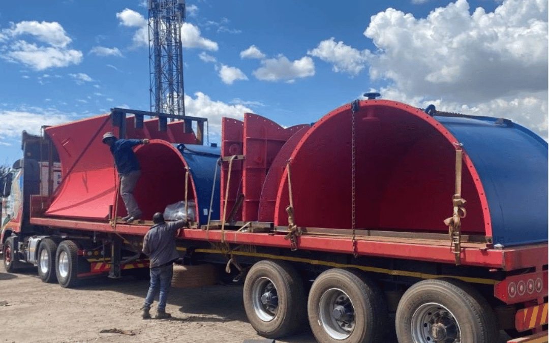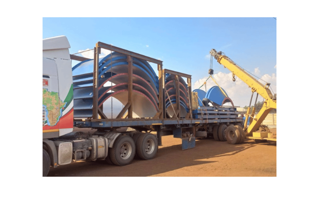 Transport Planning of truck loads for transport to the site was challenging. Individual components were fitted on cradles designed to optimise the transport deck space, minimise the number of loads and ensure the integrity of the items (including rubber linings and paintwork) during transportation to the site. Transport jigs were designed and built to brace the components and reduce vibration during the trip. Careful load packing optimized weight distribution on the truck for the long trip to the DRC. Bureau Veritas Certification and pre-clearing ensured that there were no customs delays at the South African, Zimbabwean and DRC border crossings. Due to the remote location of the mine in the DRC no abnormal transport was possible. The logistics of normal truck loads required detailed design consideration of component size and the location of bolted joints in the Reactors before the structural modelling, analysis and design commenced and long before any trucks started rolling to site Packing Each Reactor is 9.9m in diameter and 11.6m high with 3265 parts. All the components of each Reactor required to be packed so that upon arrival at site the Reactor could be assembled from the designated package. The Reactor components and small parts had to be carefully packed in specially designed cradles to optimise each load and minimise the number of loads to site