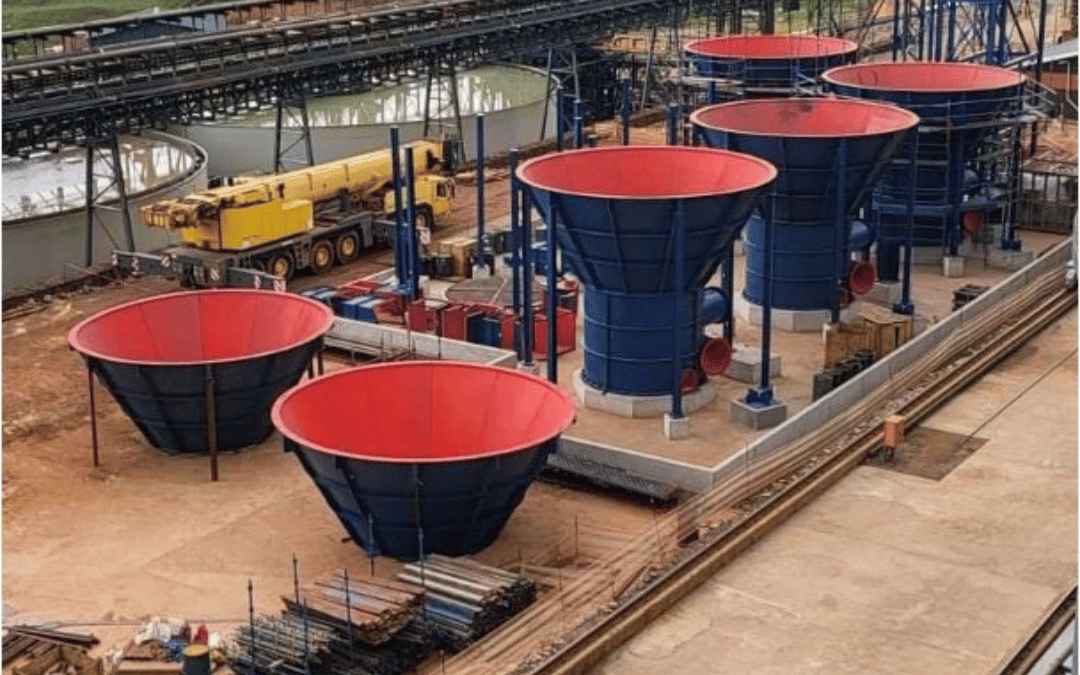 Viva Engineering’s scope included :  Structural design  Shop detailing  Fabrication  Rubber lining  Corrosion protection Rubber lining and corrosion protection was undertaken prior to delivery to the site in the DRC. Due to the remote location of the mine in the DRC, careful consideration was given to the constructability of the project. The logistical challenge of transporting components of the Reactor that could fit onto normal trucks required careful planning. This impacted on the detailed analysis and design of bolted connections as well as shop detailing such that the assembled components fitted perfectly. An added complication was to accommodate continuity of the rubber lining between the bolted faces of each component.The first Reactor was trial assembled to prove that the jigs and manufacturing was correct. All six rubber lined Reactors were installed without a single flange hole out of place. Rubber lining is continuous on the bolted faces. This required that the shop details incorporated the lining thickness and during fabrication that spacer plates were inserted in the connections to simulate the lining. Corrosion Protection was applied to the external surfaces of the component. In addition to the six Reactors, many other complex tanks and platework was designed and fabricated, which included the plant buildings.