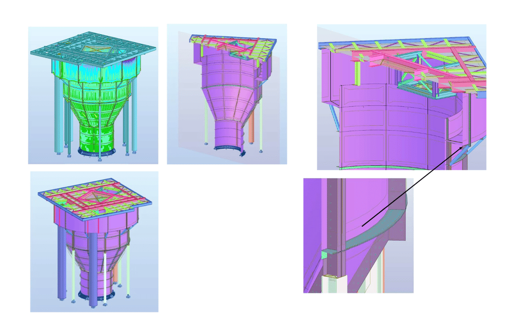 The splices or connections between each piece of the structure also form the stiffeners required for out of plane forces due to the geometry (such as at the transition points between cylindrical and conical forms) and externally applied loads (such as the supported platform, wind and equipment loads). Major areas of stress such as the transition points therefore had two plates forming the stiffener as these were also splice locations. This allowed for significant reinforcement which adequately reduced stresses.