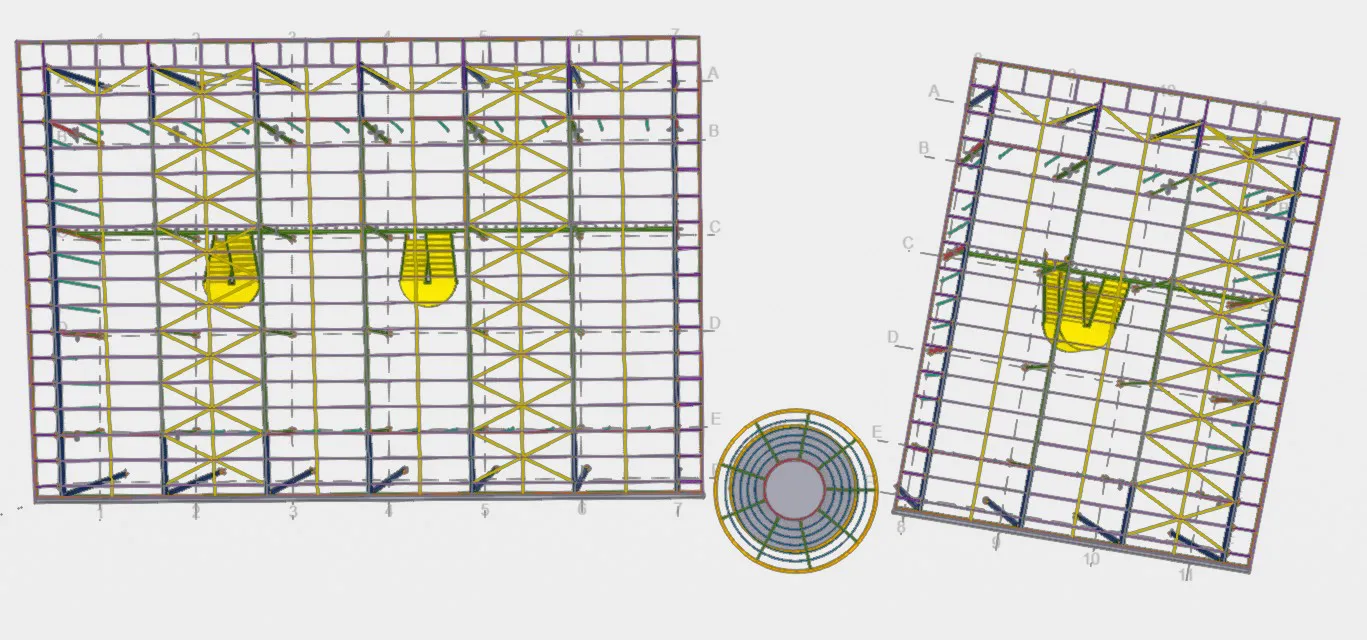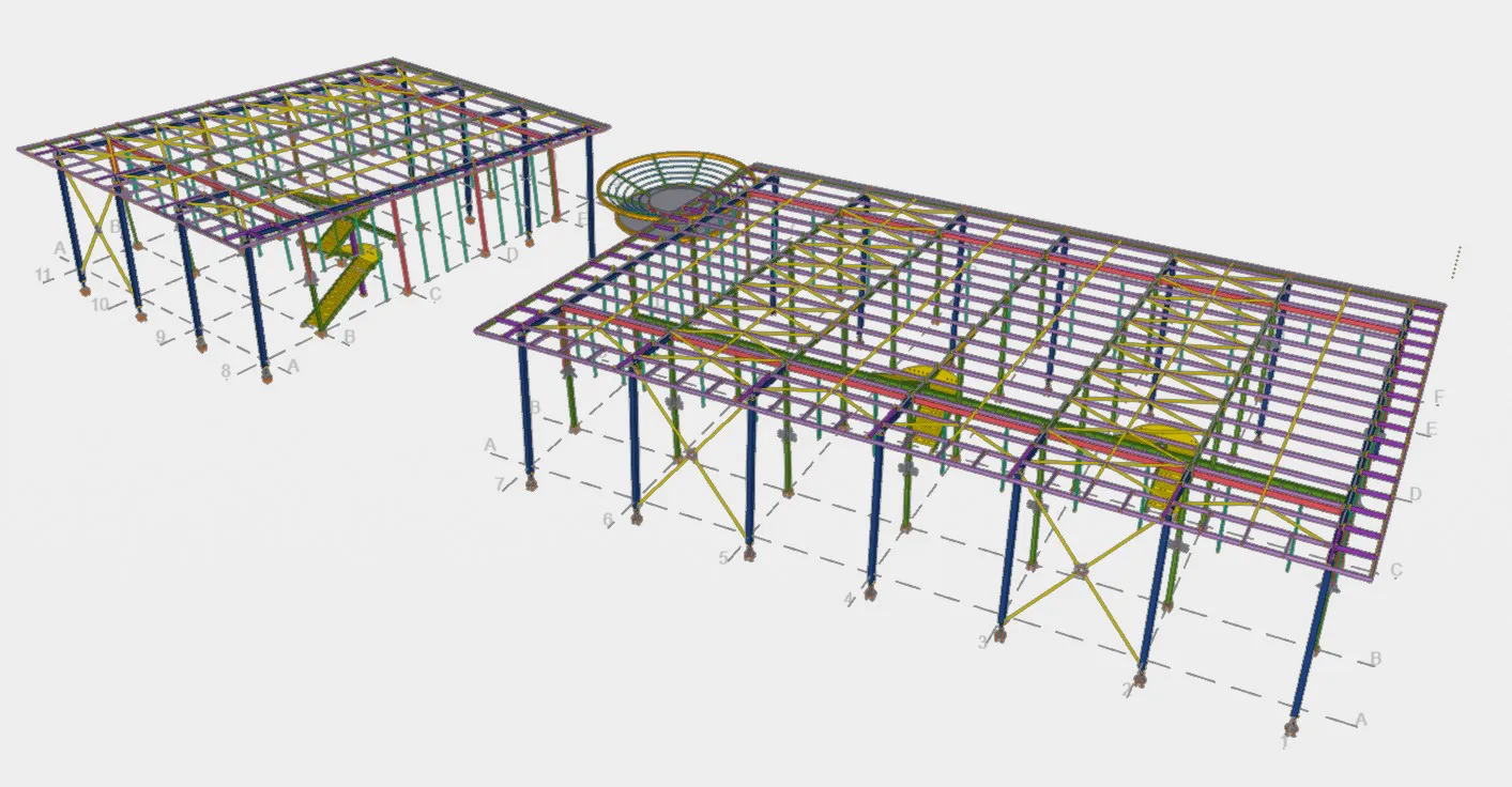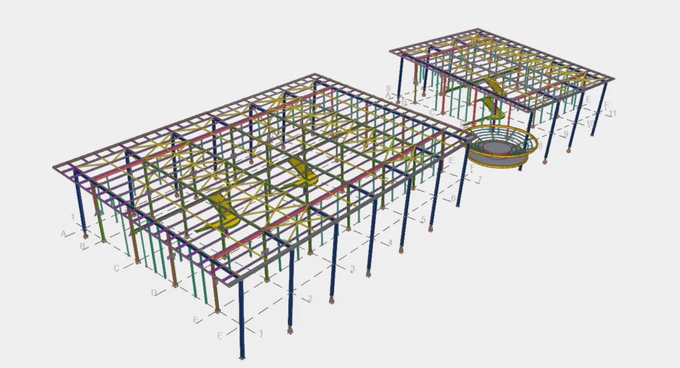 The structural system consists of a lower-level area constructed on grade, enclosed by a perimeter retaining wall. The ground floor slab is supported by concrete columns, forming the base for the steel superstructure. From this slab, a steel framework rises, incorporating a mezzanine level that is also supported by steel columns. The roof structure is composed of simply supported steel beams spanning between the columns. There are two external roof column per gridline that extend down to a separate base.