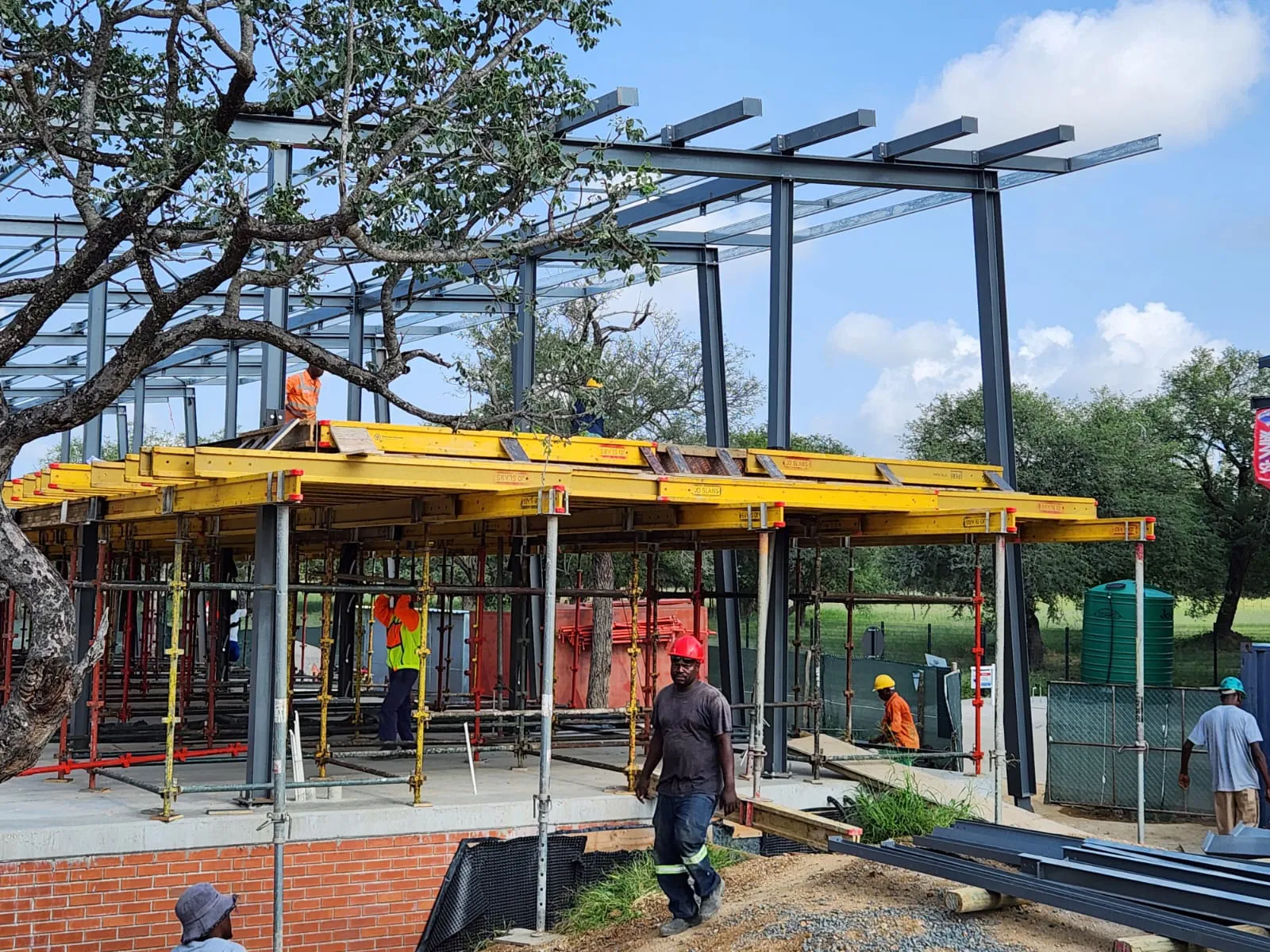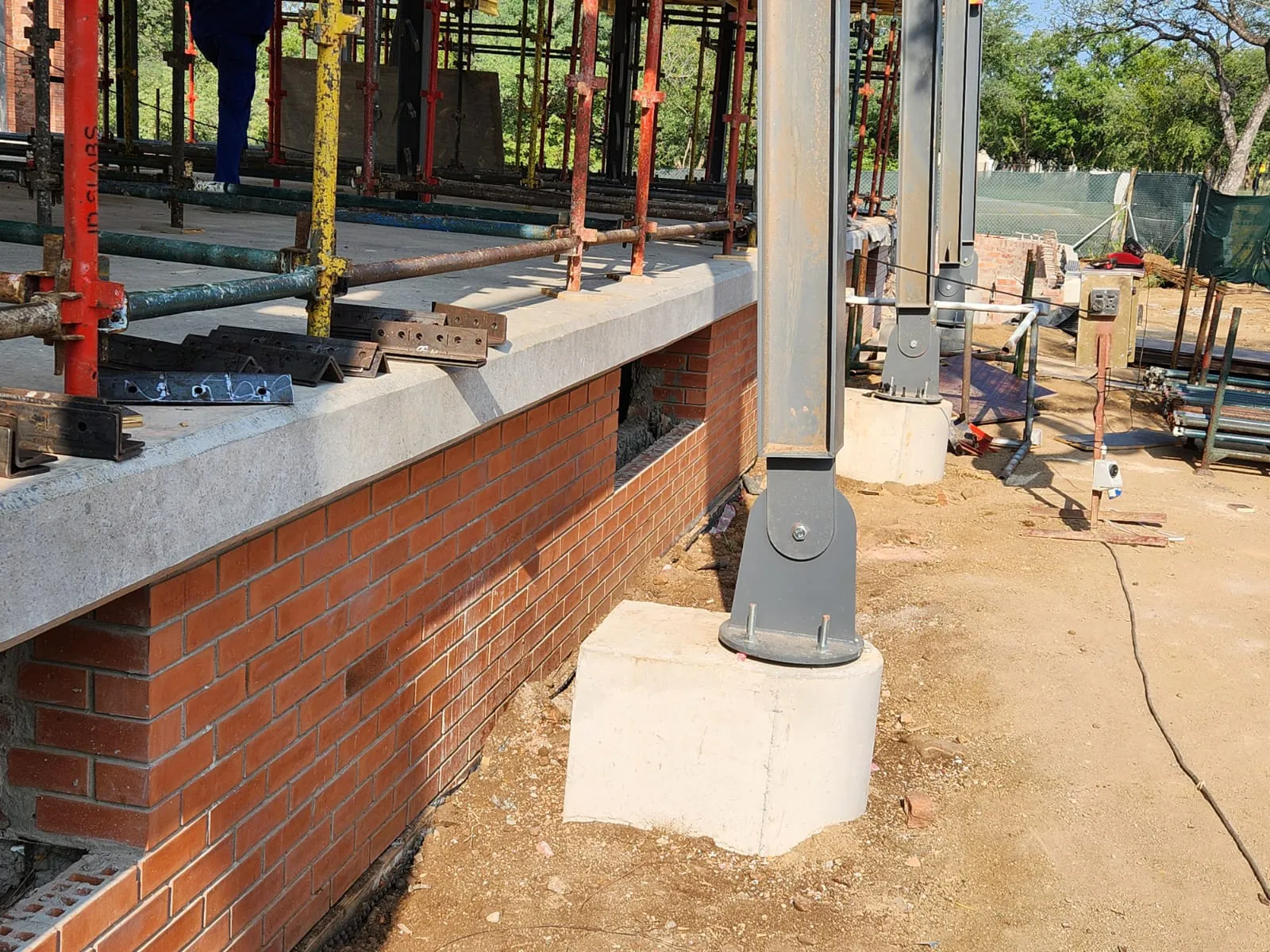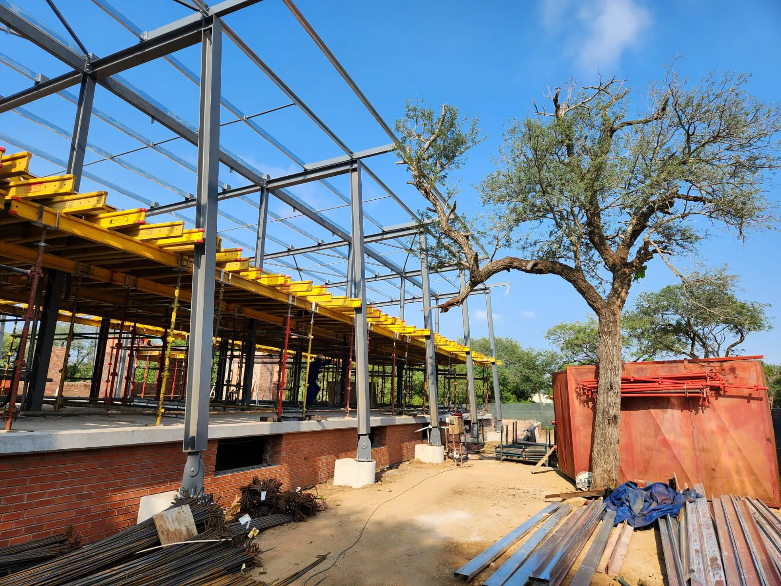 The structural system consists of a lower-level area constructed on grade, enclosed by a perimeter retaining wall. The ground floor slab is supported by concrete columns, forming the base for the steel superstructure. From this slab, a steel framework rises, incorporating a mezzanine level that is also supported by steel columns. The roof structure is composed of simply supported steel beams spanning between the columns. There are two external roof column per gridline that extend down to a separate base.