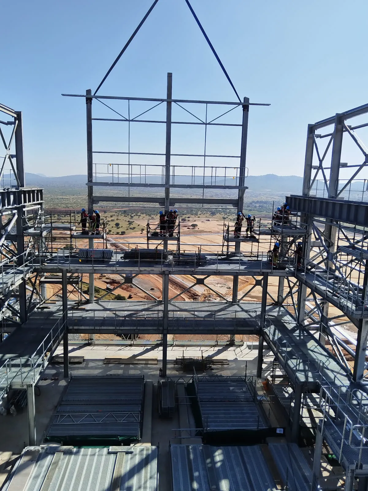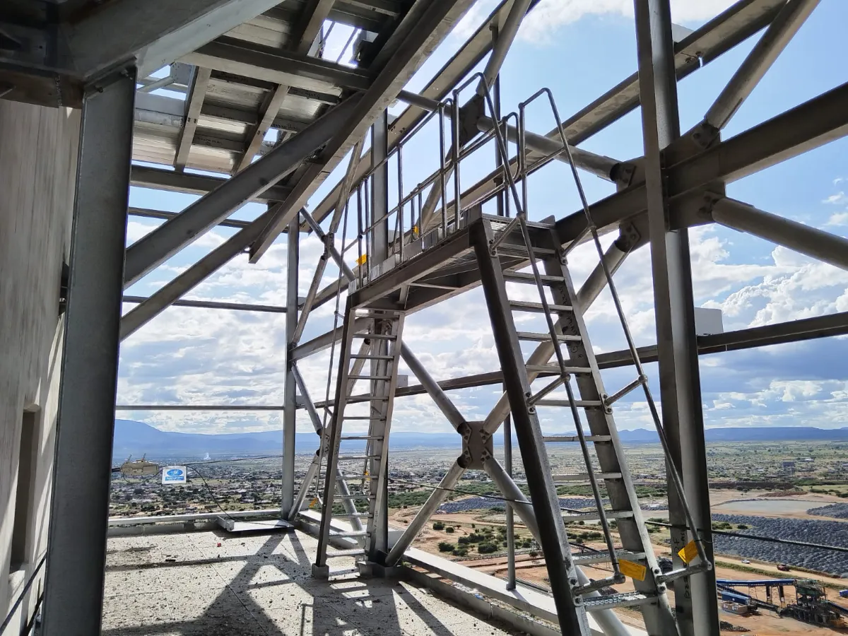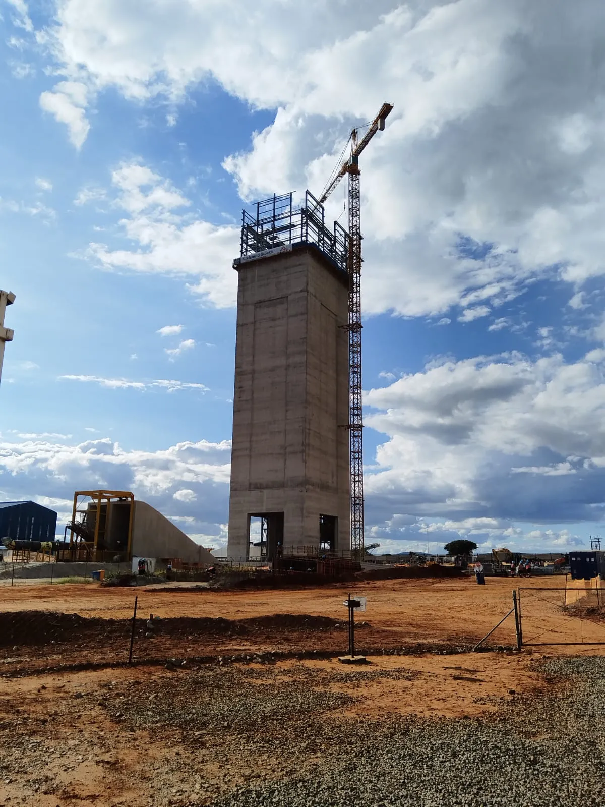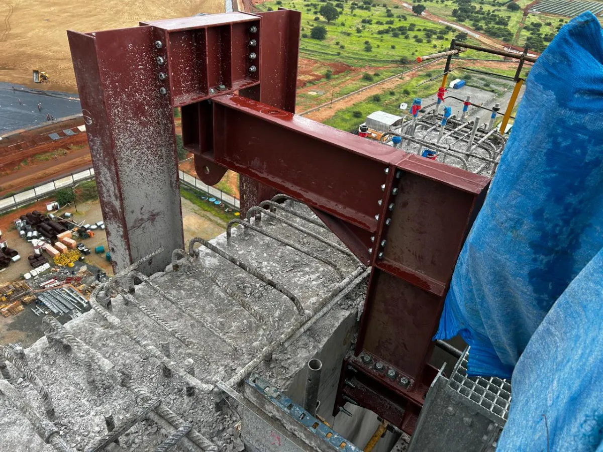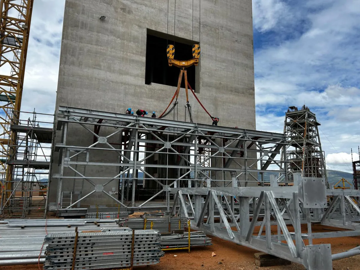 It is a mining structure so the brief was purely functional. The structure as a whole is a steel winder house erected on top of a concrete headgear. The steel structure is made up of a portal frame supported from laced columns. There is a large crane girder supported on top of the laced column section. The bracing of the structure around the cantilever portion acts to create a large truss system providing redundancy in the cast in plates.