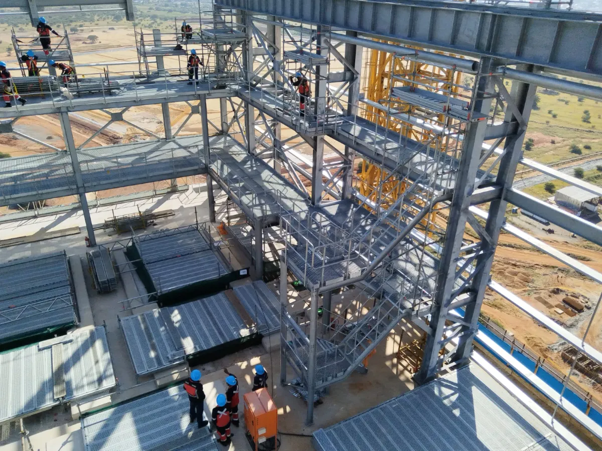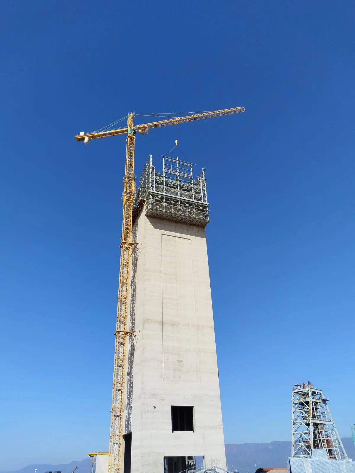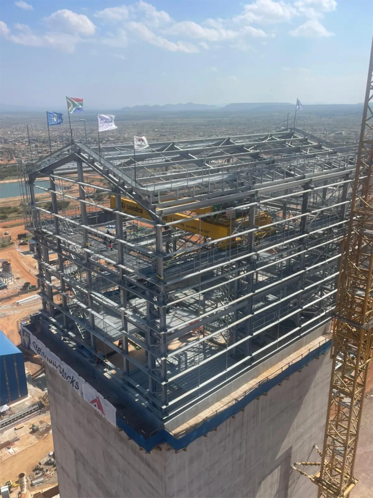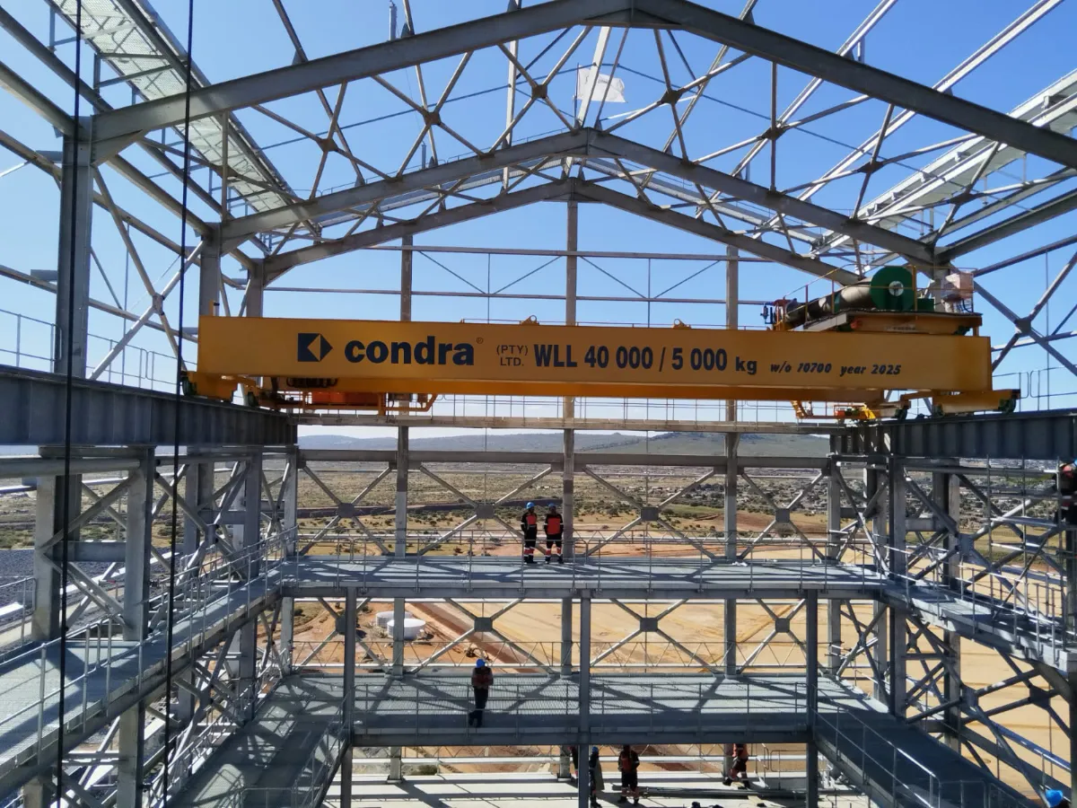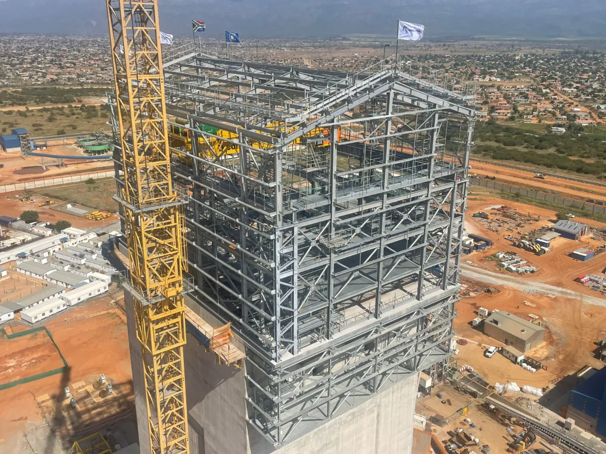 It is a mining structure so the brief was purely functional. The structure as a whole is a steel winder house erected on top of a concrete headgear. The steel structure is made up of a portal frame supported from laced columns. There is a large crane girder supported on top of the laced column section. The bracing of the structure around the cantilever portion acts to create a large truss system providing redundancy in the cast in plates.