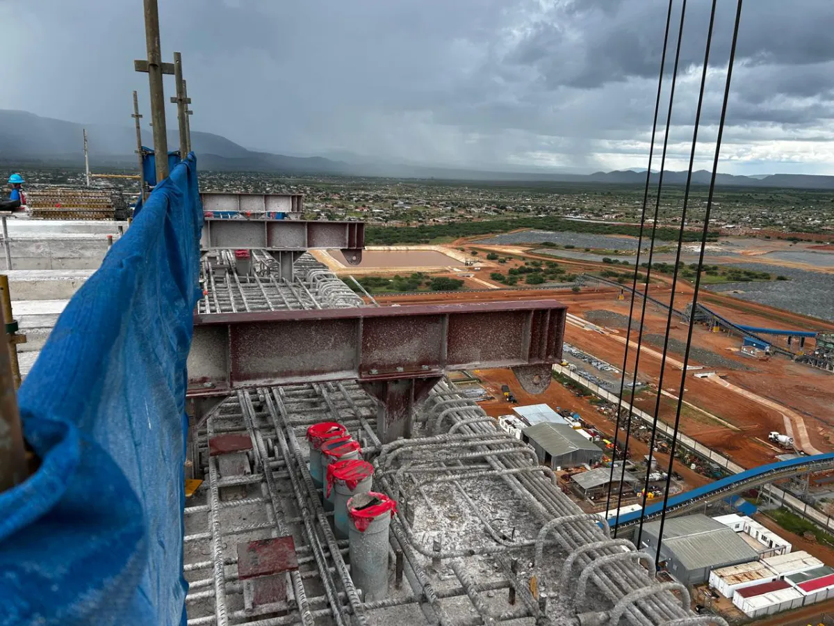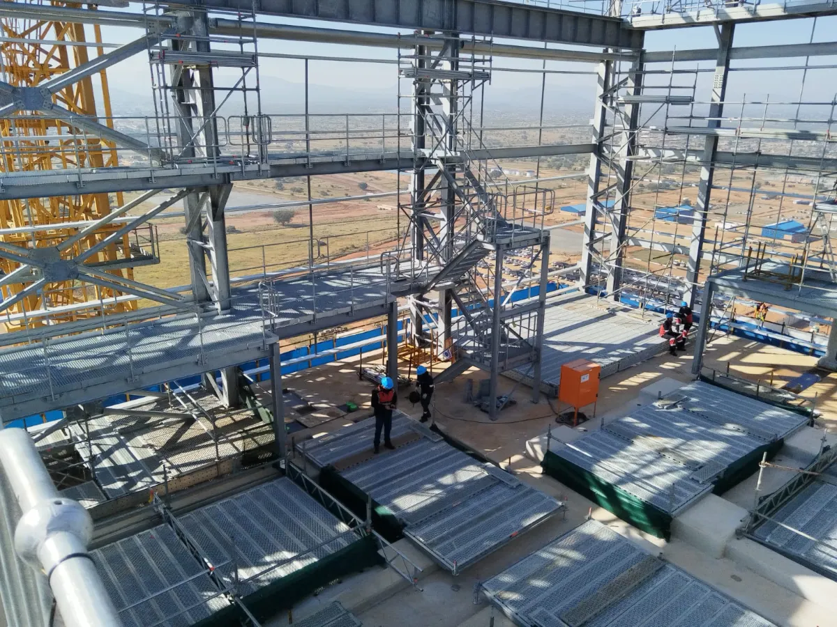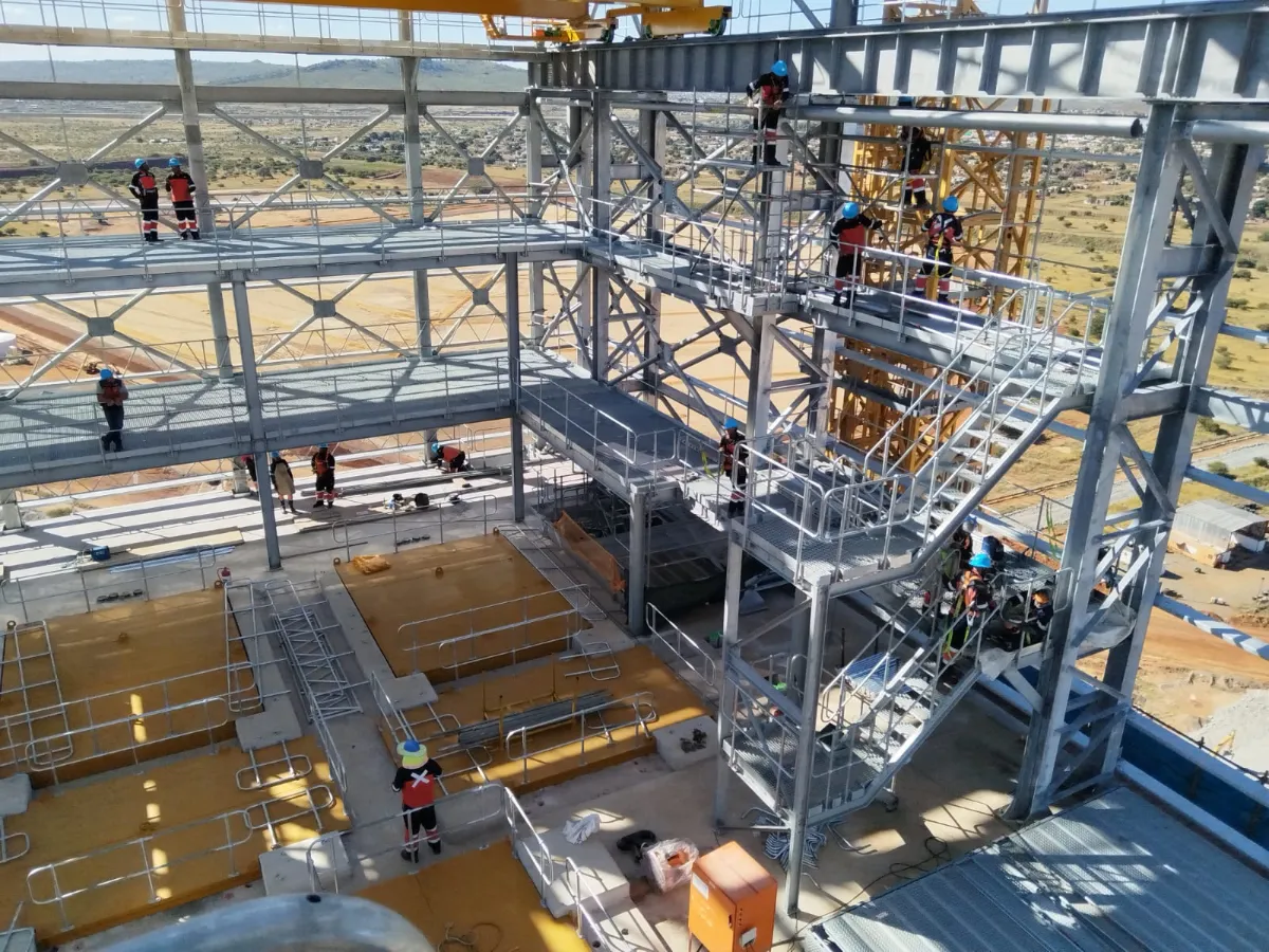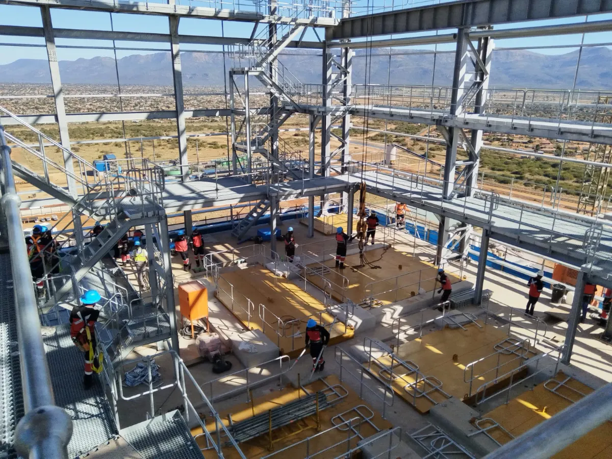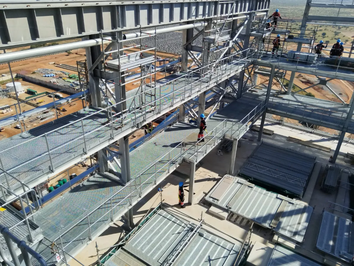 It is a mining structure so the brief was purely functional. The structure as a whole is a steel winder house erected on top of a concrete headgear. The steel structure is made up of a portal frame supported from laced columns. There is a large crane girder supported on top of the laced column section. The bracing of the structure around the cantilever portion acts to create a large truss system providing redundancy in the cast in plates.