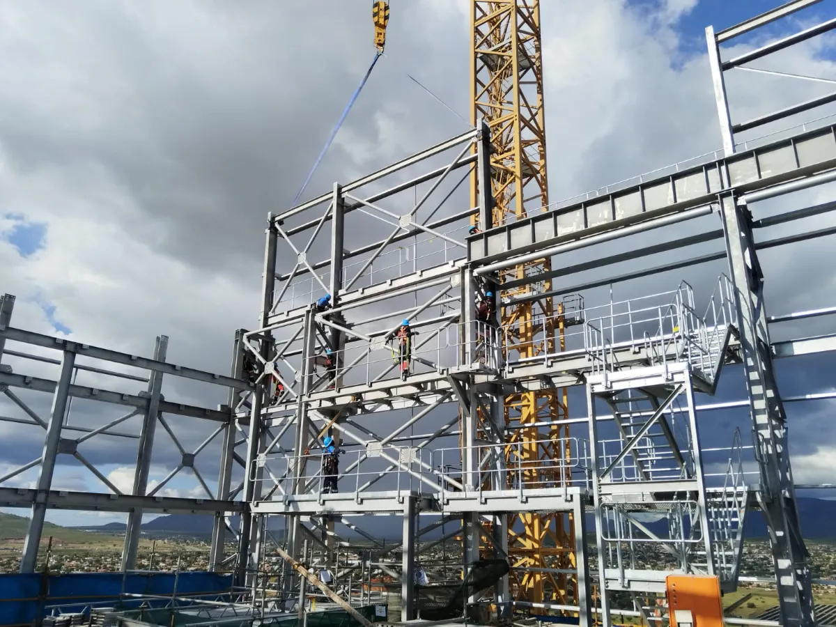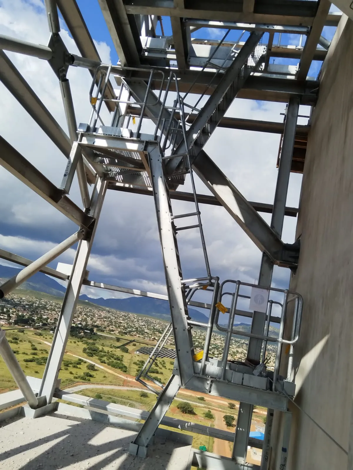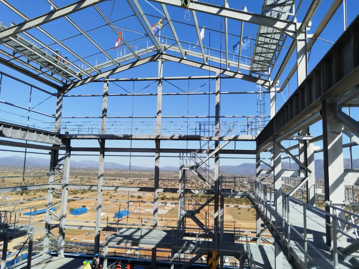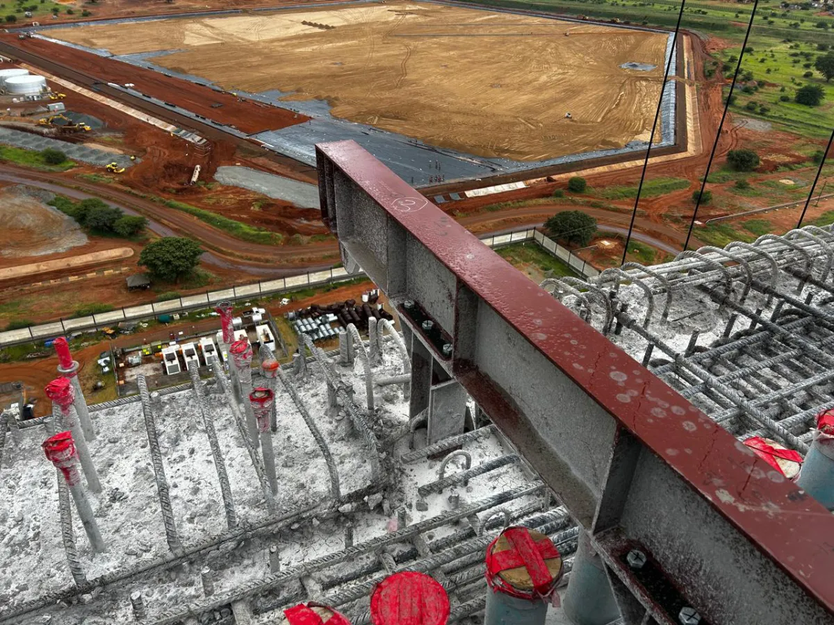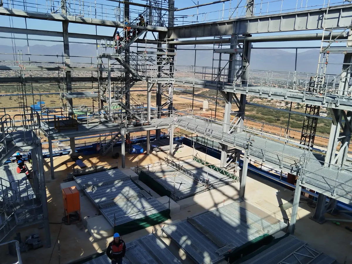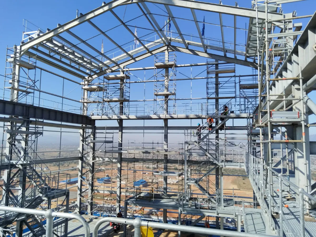 It is a mining structure so the brief was purely functional. The structure as a whole is a steel winder house erected on top of a concrete headgear. The steel structure is made up of a portal frame supported from laced columns. There is a large crane girder supported on top of the laced column section. The bracing of the structure around the cantilever portion acts to create a large truss system providing redundancy in the cast in plates.