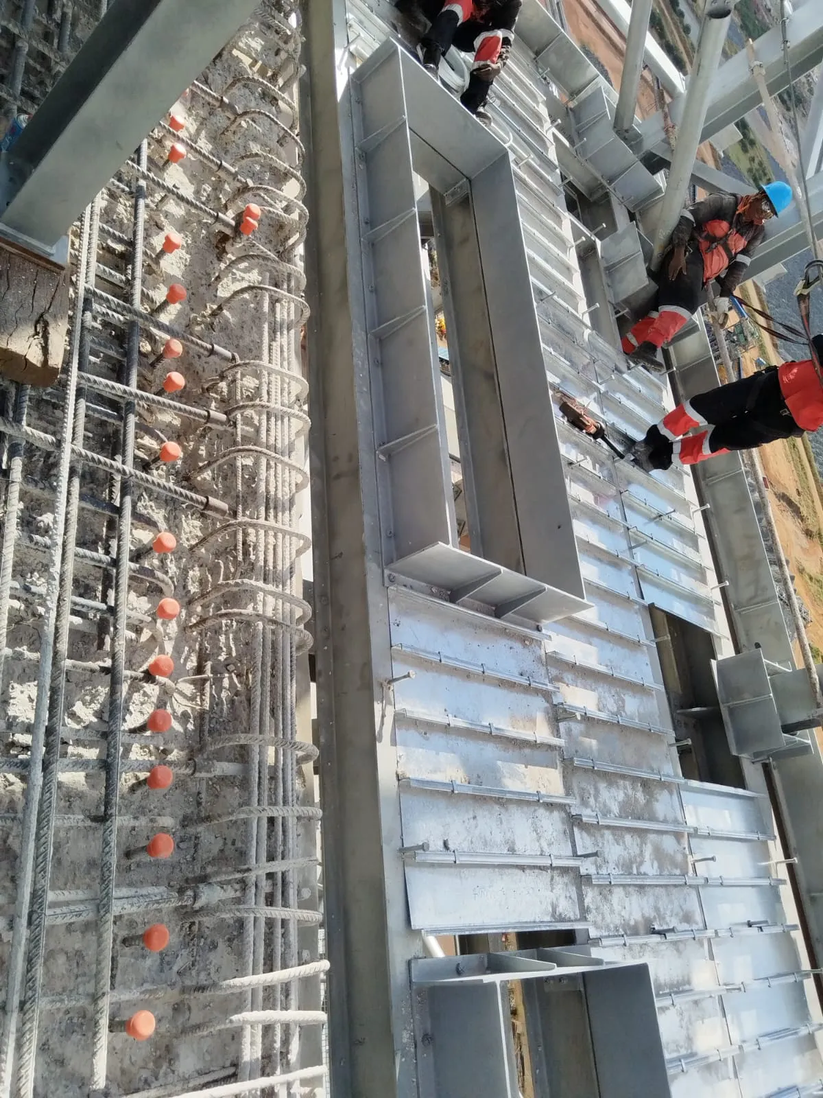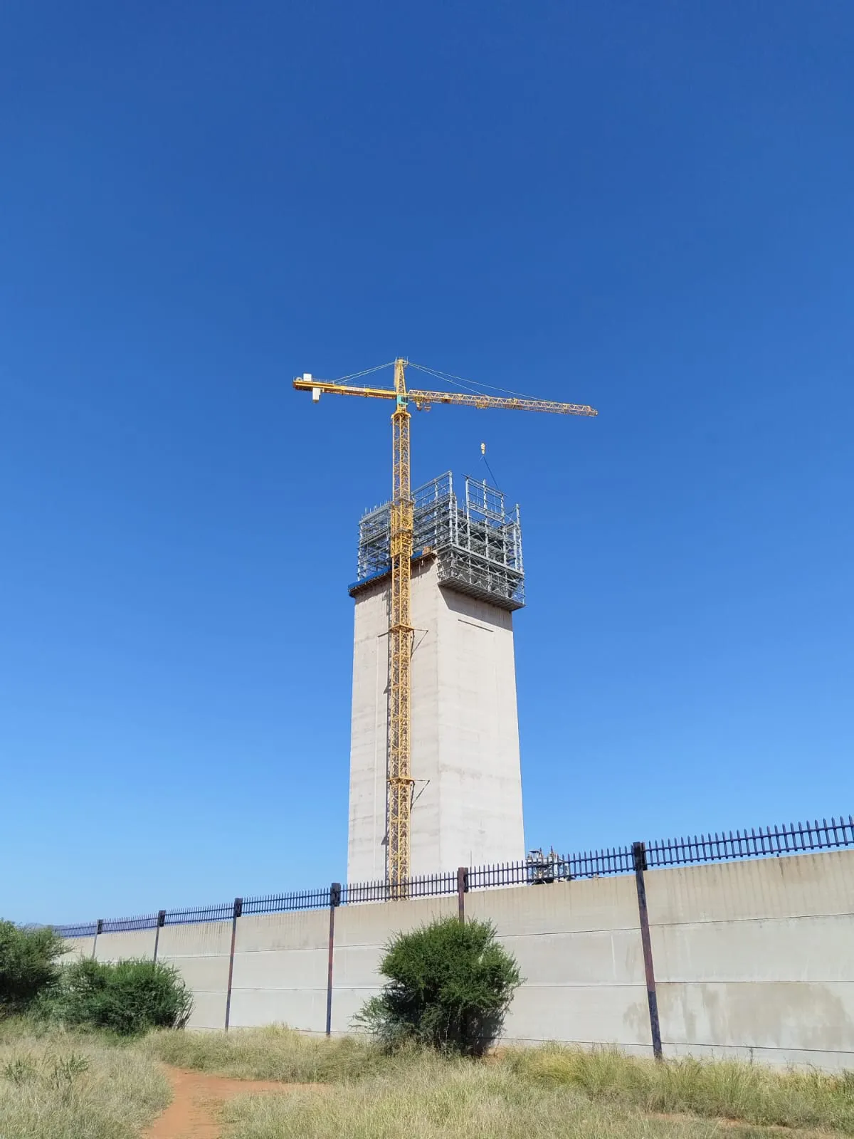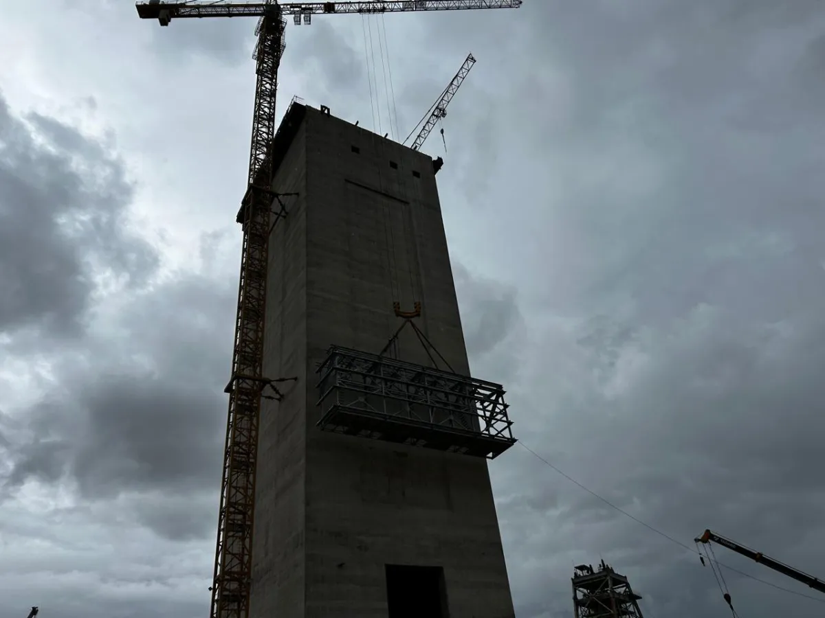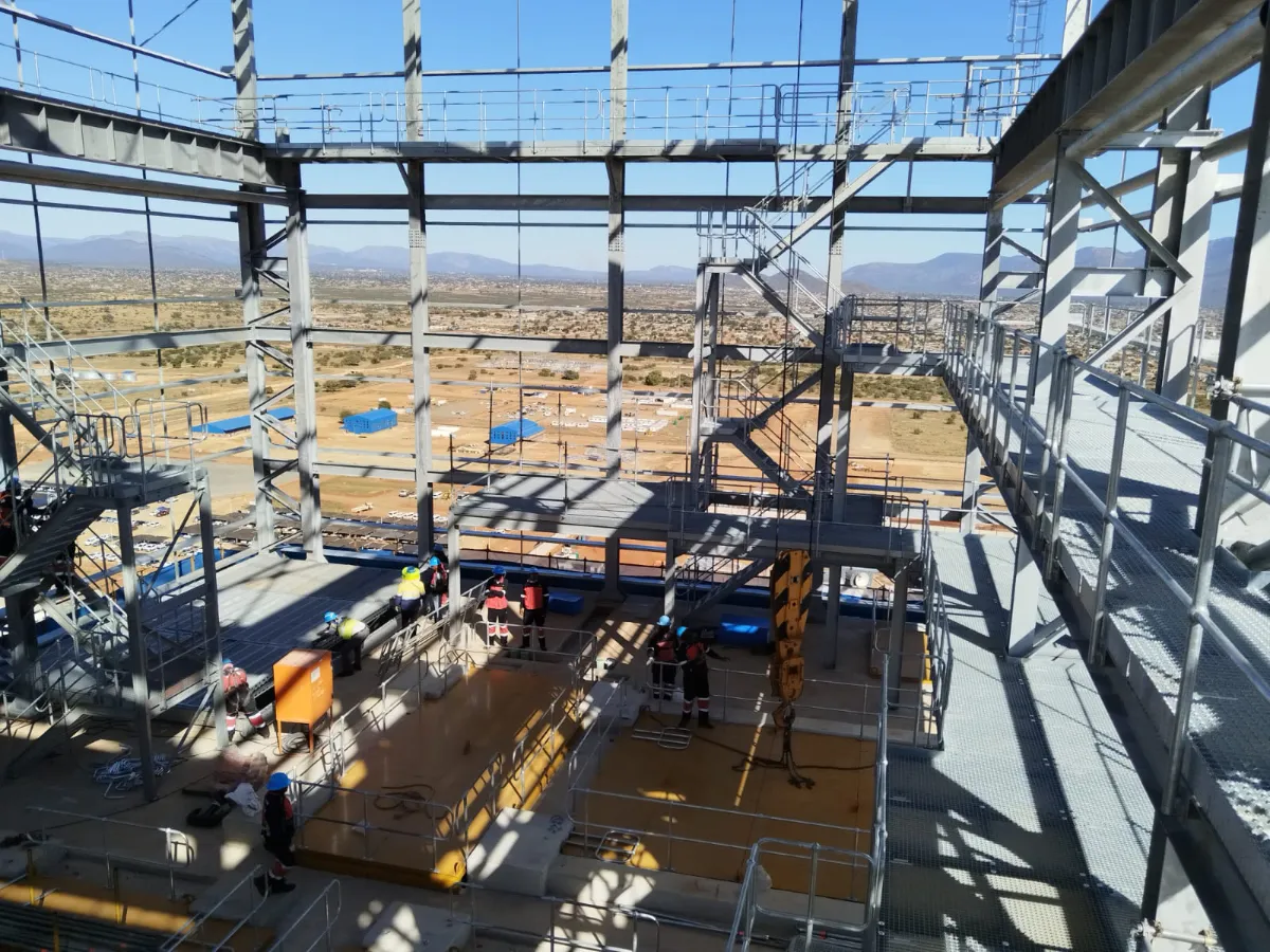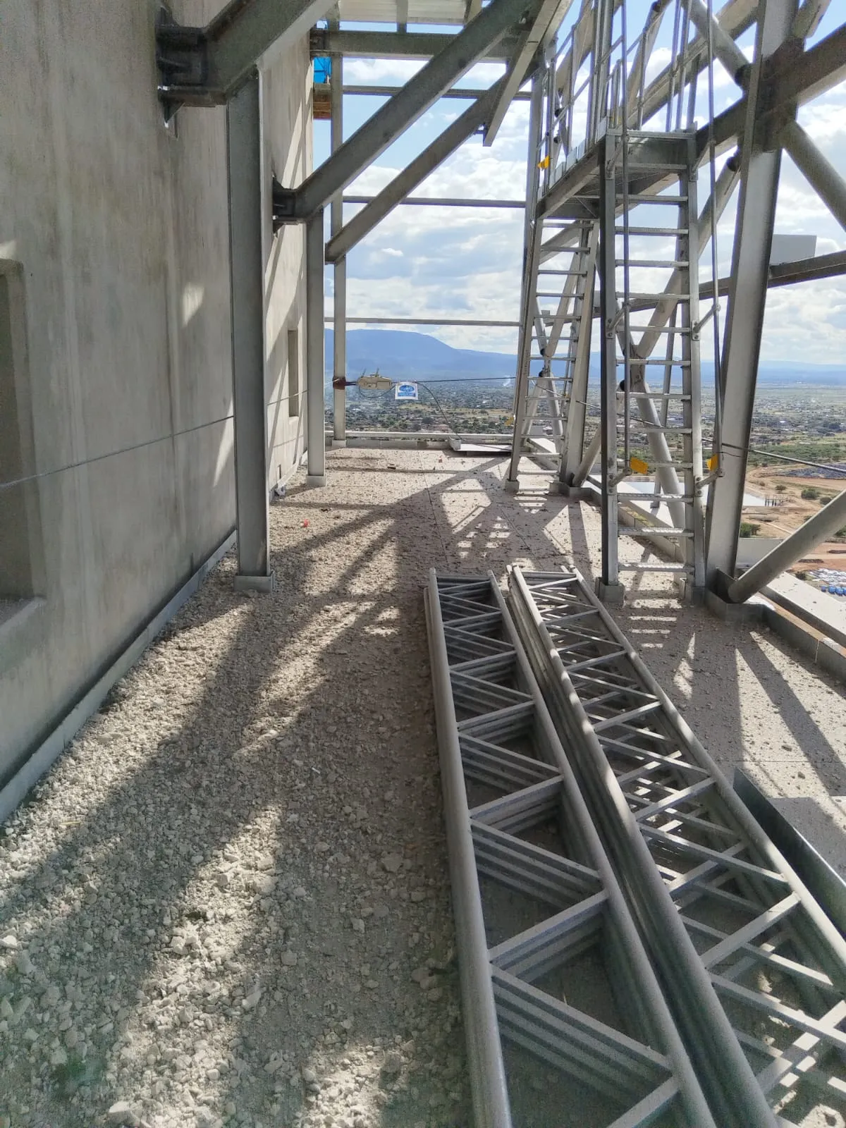 It is a mining structure so the brief was purely functional. The structure as a whole is a steel winder house erected on top of a concrete headgear. The steel structure is made up of a portal frame supported from laced columns. There is a large crane girder supported on top of the laced column section. The bracing of the structure around the cantilever portion acts to create a large truss system providing redundancy in the cast in plates.