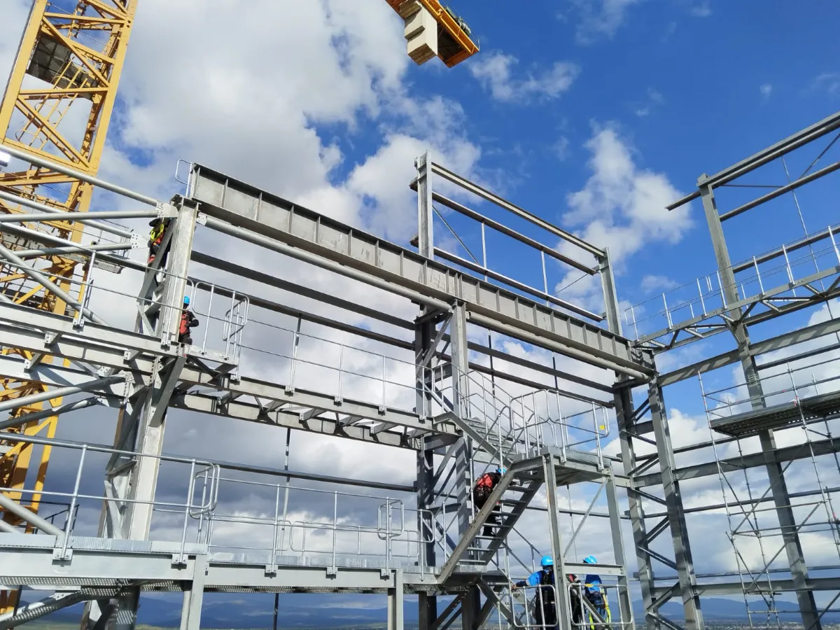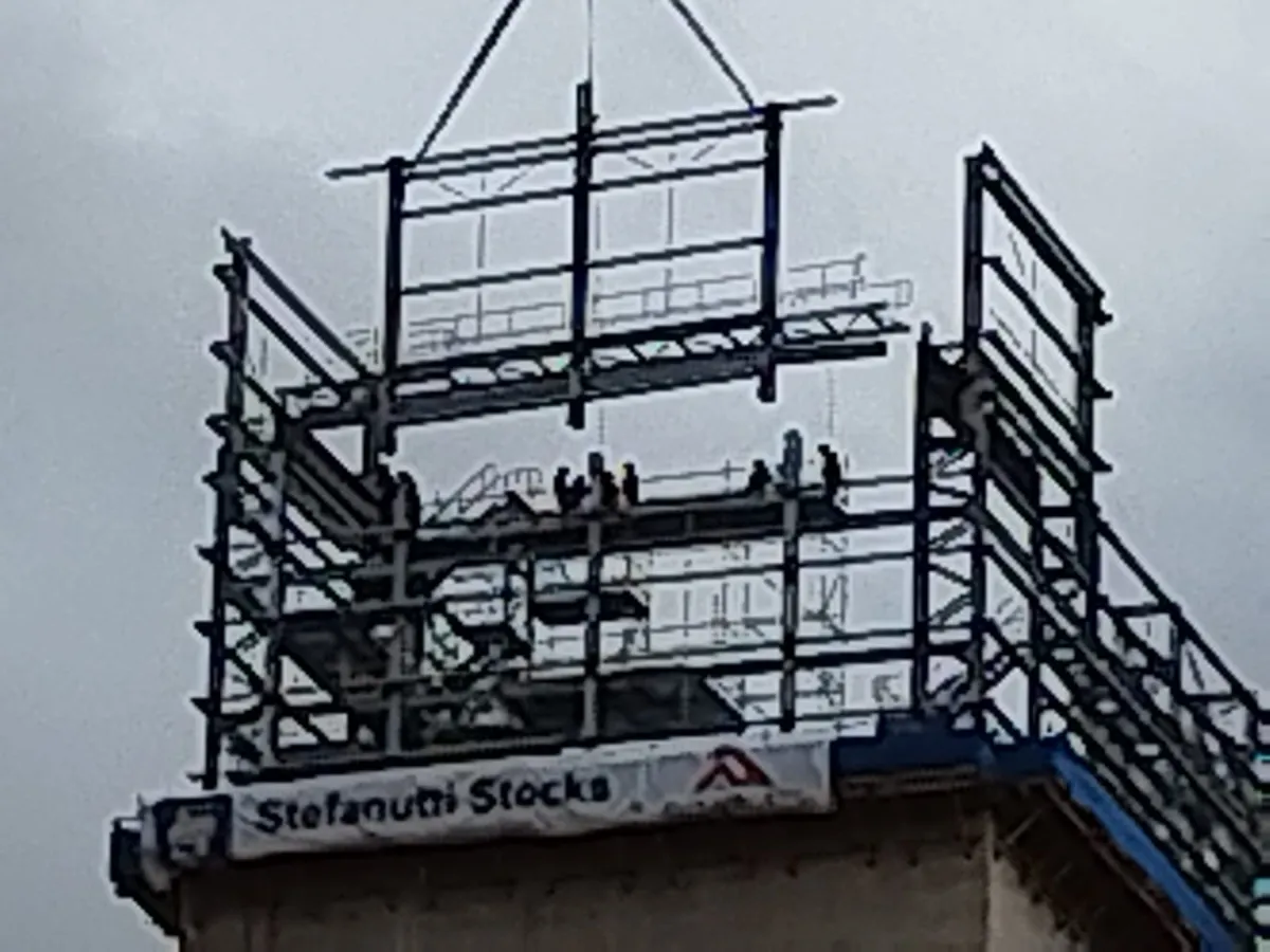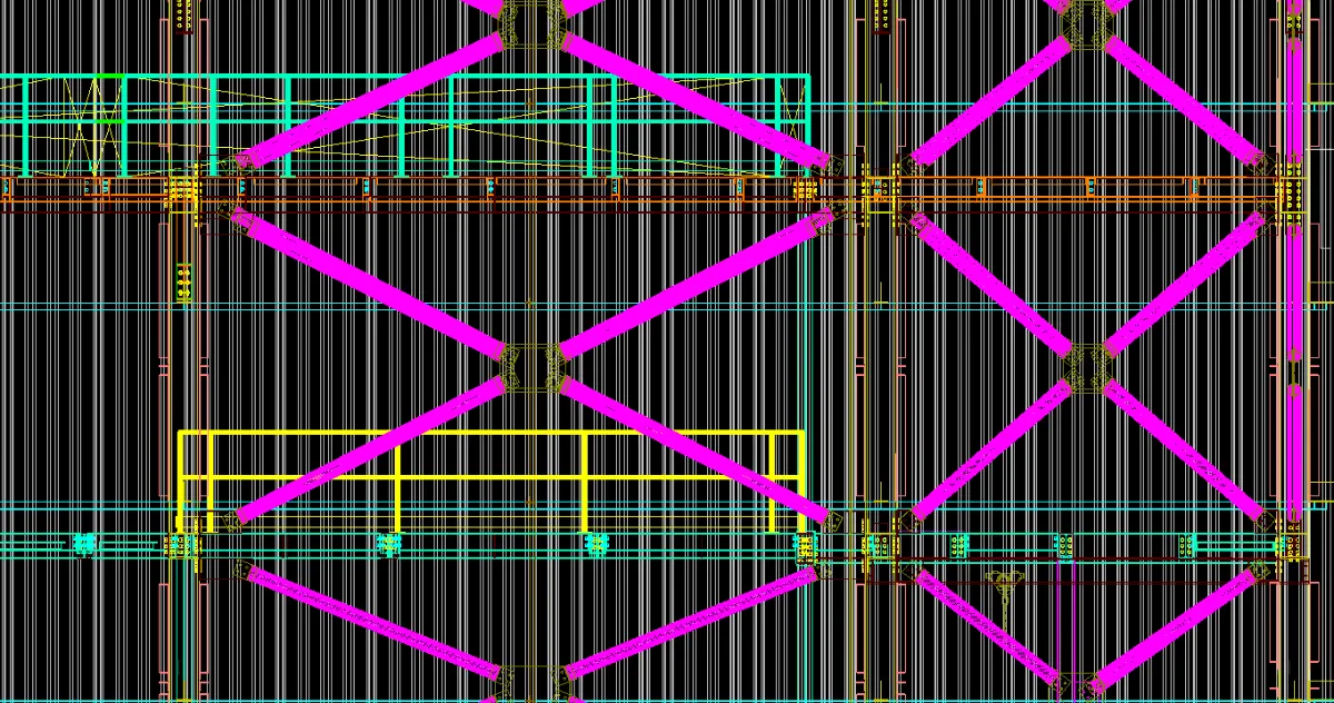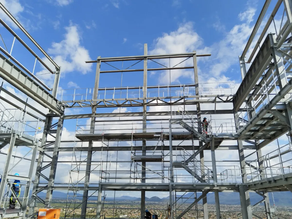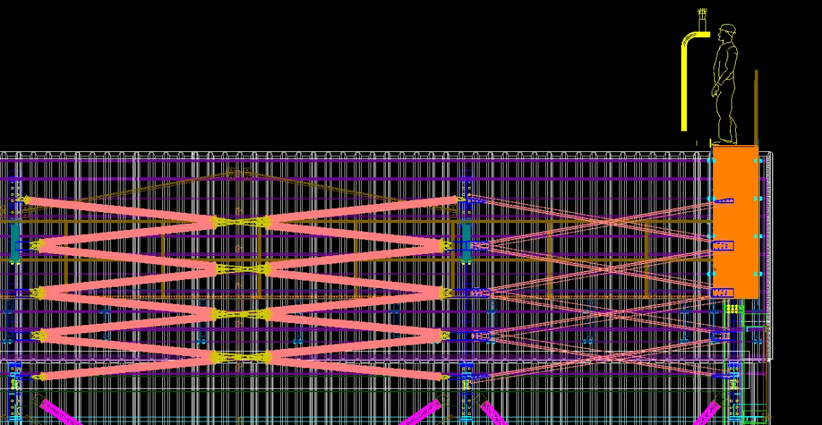 The cast in plates had a maximum of 600kN tension load allowed. The design had to ensure these loads were not exceeded as the cast in plates were completed before the design. As the loads were initially too high the addition of full braced bays to turn 3 faces into braced trusses resulted in acceptable loads. As the cantilever portion of the structure needed to be welded on site onto the cast in plates. The concern was alignment between all 4 points. It was then decided to create temporary steel frames to hang the cantilever portion from pins with adjustable supports to align all the points.