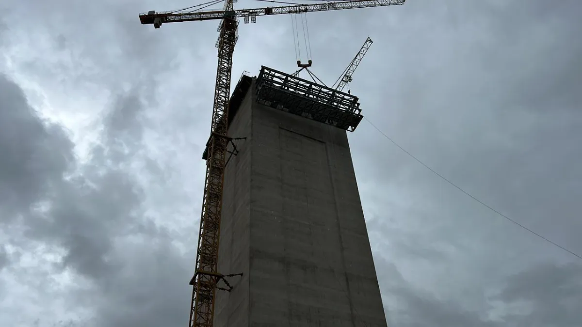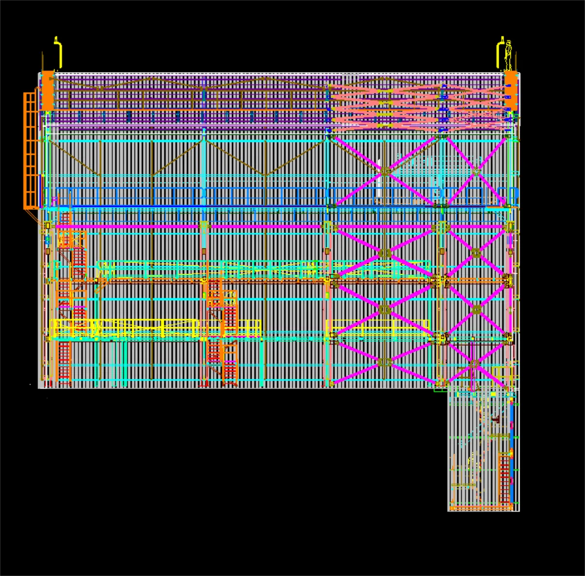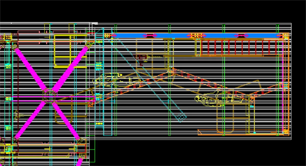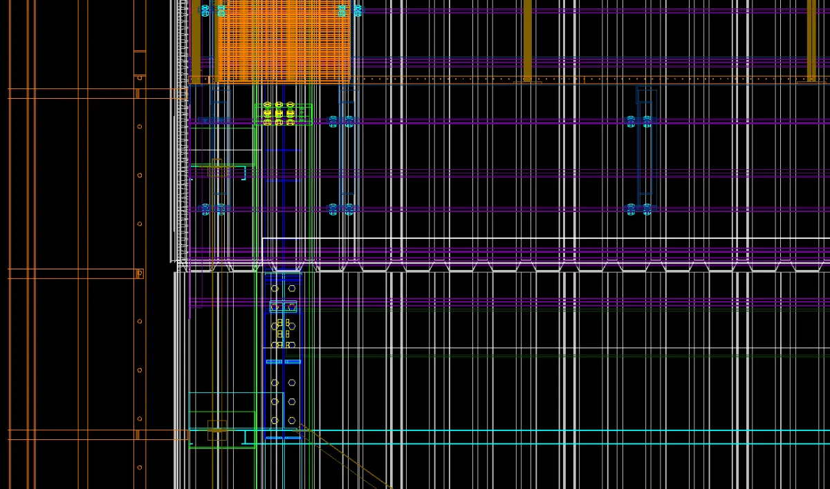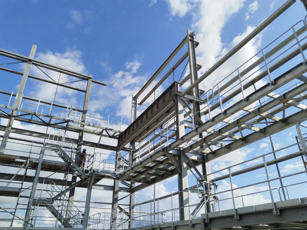 The cast in plates had a maximum of 600kN tension load allowed. The design had to ensure these loads were not exceeded as the cast in plates were completed before the design. As the loads were initially too high the addition of full braced bays to turn 3 faces into braced trusses resulted in acceptable loads. As the cantilever portion of the structure needed to be welded on site onto the cast in plates. The concern was alignment between all 4 points. It was then decided to create temporary steel frames to hang the cantilever portion from pins with adjustable supports to align all the points.