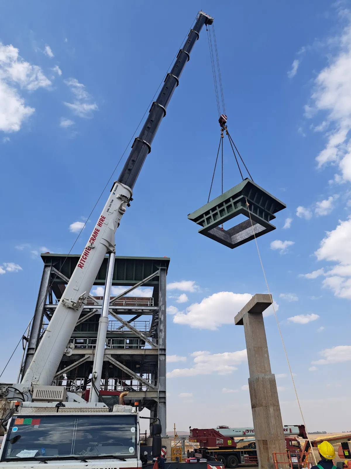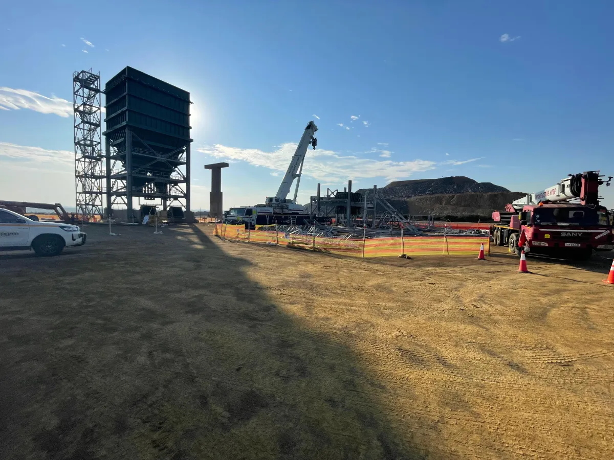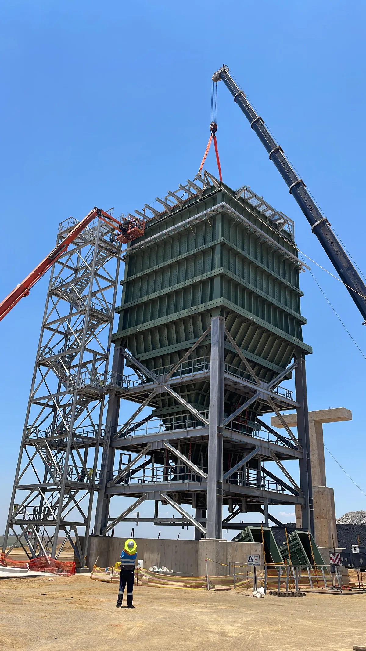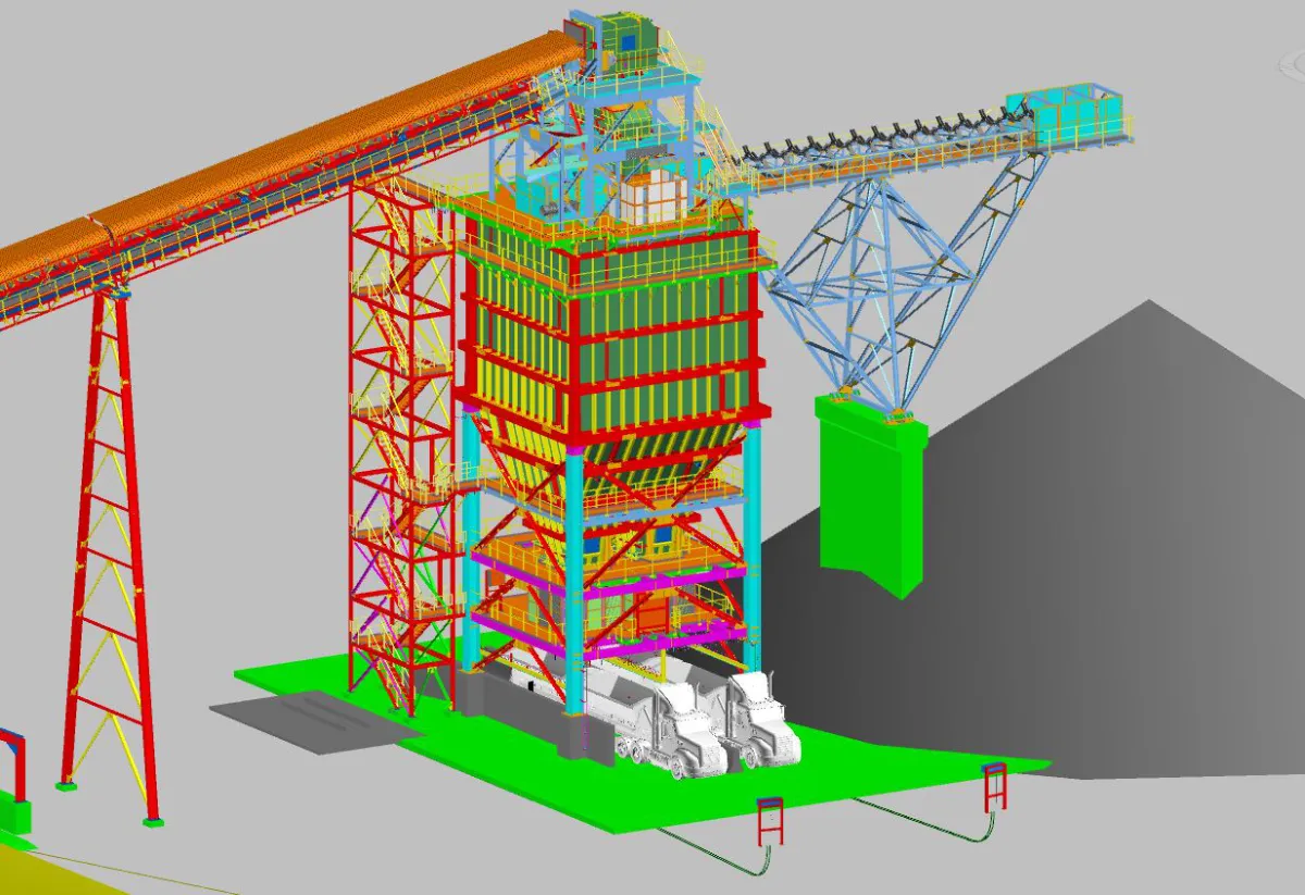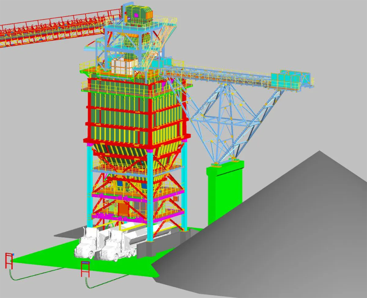 The radial gates and profile chutes of both truck loading bays are controlled by a single containerised hydraulic powerpack, located at ground level next to the LOS structure. The hydraulic powerpack is designed to ensure that the two loading bays can operate independently from each other. The speed of the actuators remains consistent regardless of any overlap in the duty cycle between the two loading bays - this is essential to ensure a consistent loading performance. The powerpack is equipped with accumulators that provide for the automatic closure of the radial gates and lifting of the profile chutes in the event of a power failure or hydraulic system failure. The truck loadout station consists of a reinforced concrete foundation with reinforced concrete stub columns linked with a R.C. Wall in the directions of truck travel below the bin. Above the truck occupied zone the bin consists of a structural steel frame up to the underside of the bin. The bin consists of structural steel platework stiffened with H-columns in the corners.