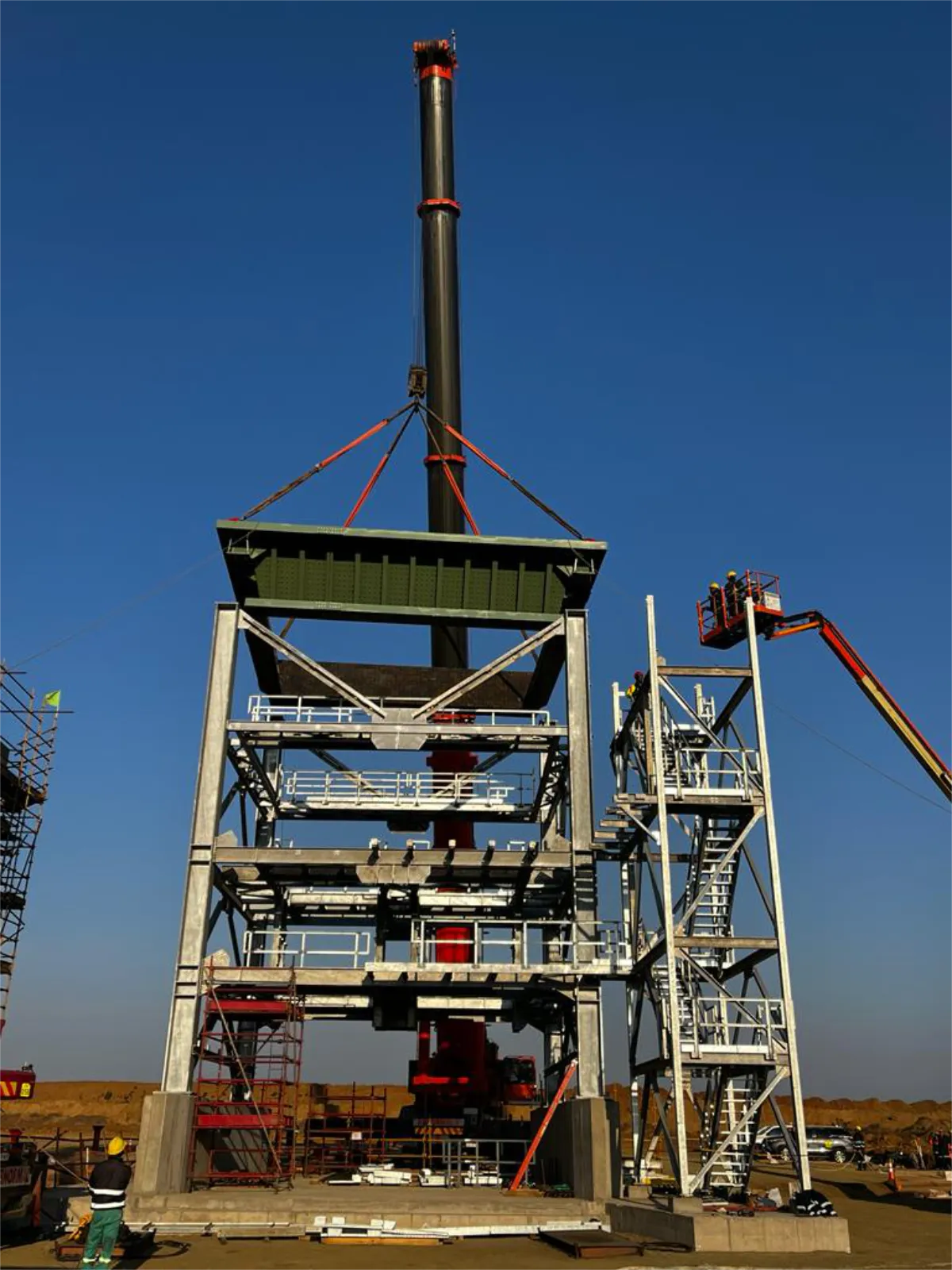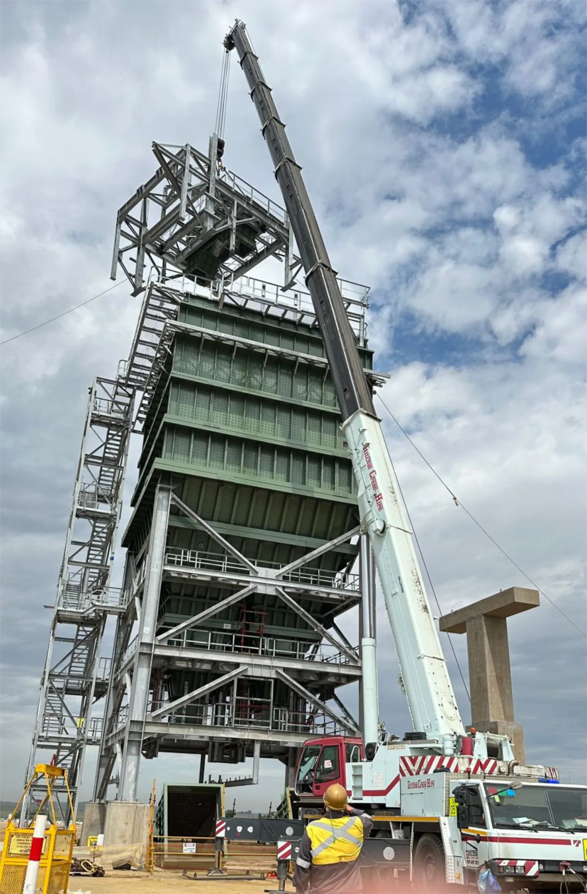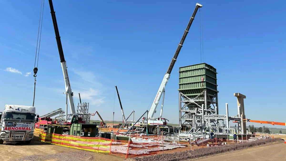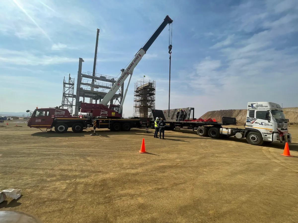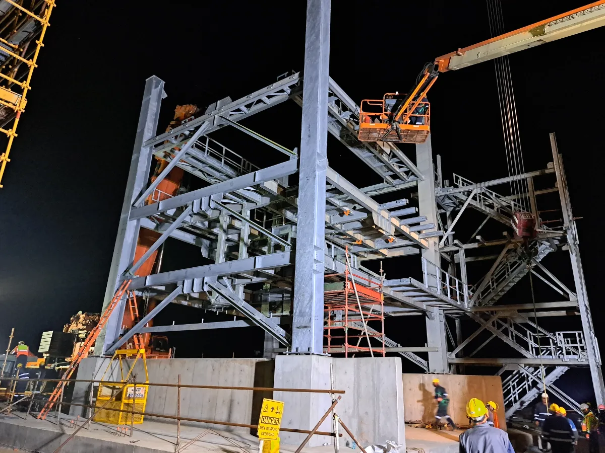 The radial gates and profile chutes of both truck loading bays are controlled by a single containerised hydraulic powerpack, located at ground level next to the LOS structure. The hydraulic powerpack is designed to ensure that the two loading bays can operate independently from each other. The speed of the actuators remains consistent regardless of any overlap in the duty cycle between the two loading bays - this is essential to ensure a consistent loading performance. The powerpack is equipped with accumulators that provide for the automatic closure of the radial gates and lifting of the profile chutes in the event of a power failure or hydraulic system failure. The truck loadout station consists of a reinforced concrete foundation with reinforced concrete stub columns linked with a R.C. Wall in the directions of truck travel below the bin. Above the truck occupied zone the bin consists of a structural steel frame up to the underside of the bin. The bin consists of structural steel platework stiffened with H-columns in the corners.