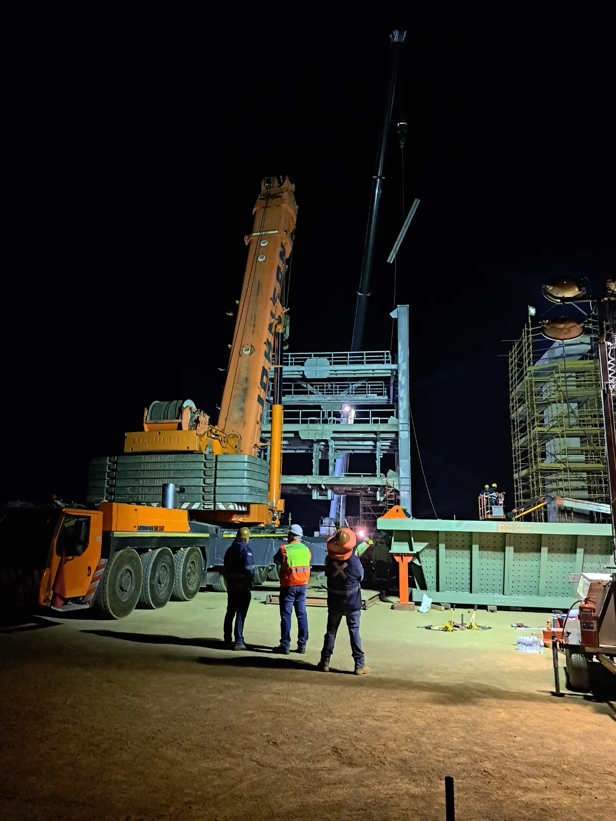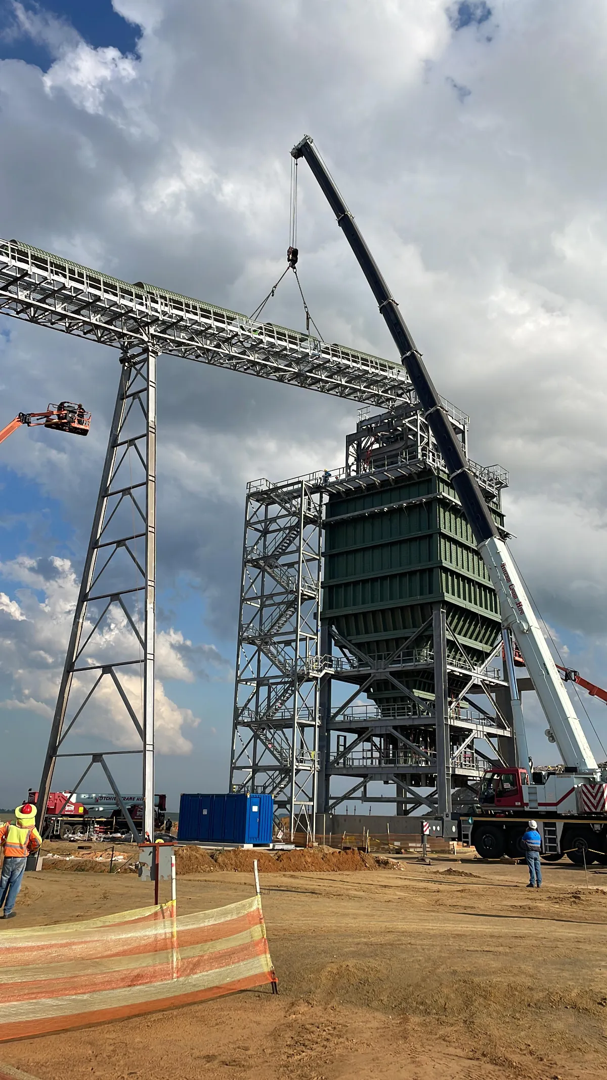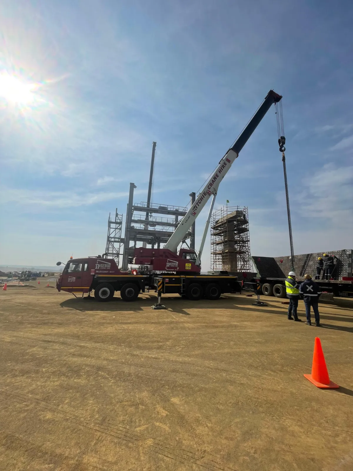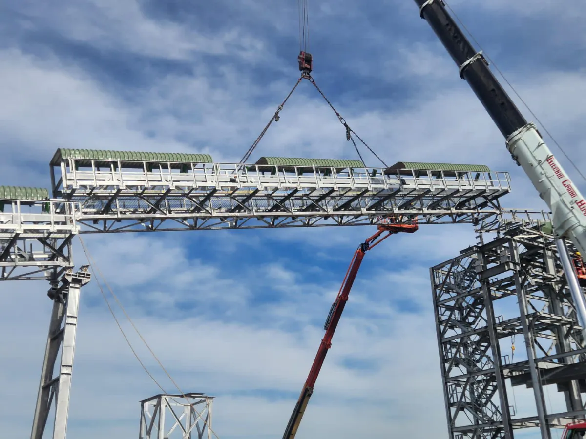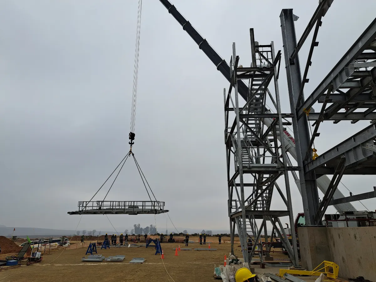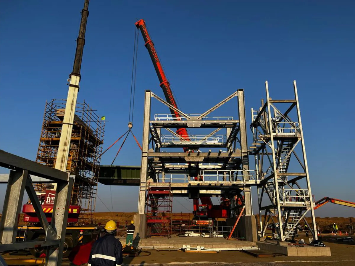 The radial gates and profile chutes of both truck loading bays are controlled by a single containerised hydraulic powerpack, located at ground level next to the LOS structure. The hydraulic powerpack is designed to ensure that the two loading bays can operate independently from each other. The speed of the actuators remains consistent regardless of any overlap in the duty cycle between the two loading bays - this is essential to ensure a consistent loading performance. The powerpack is equipped with accumulators that provide for the automatic closure of the radial gates and lifting of the profile chutes in the event of a power failure or hydraulic system failure. The truck loadout station consists of a reinforced concrete foundation with reinforced concrete stub columns linked with a R.C. Wall in the directions of truck travel below the bin. Above the truck occupied zone the bin consists of a structural steel frame up to the underside of the bin. The bin consists of structural steel platework stiffened with H-columns in the corners.