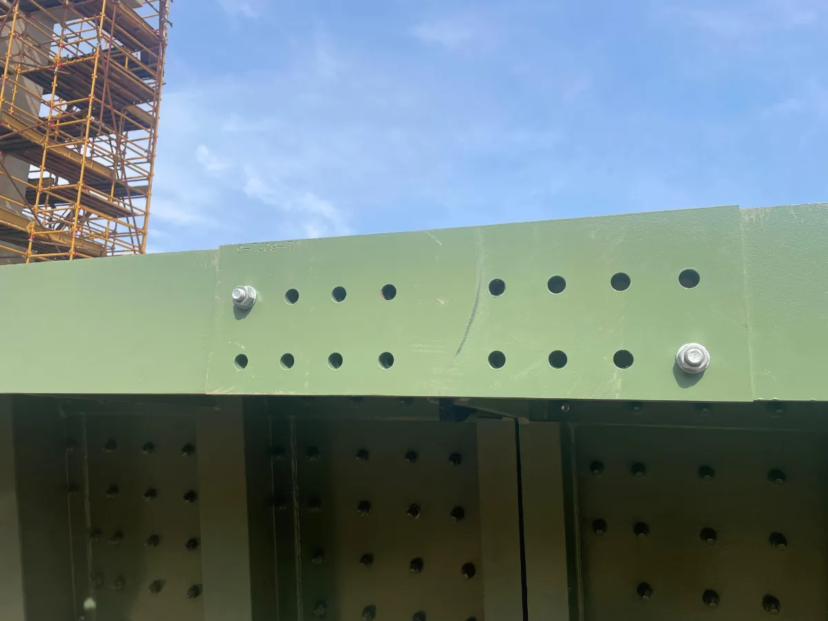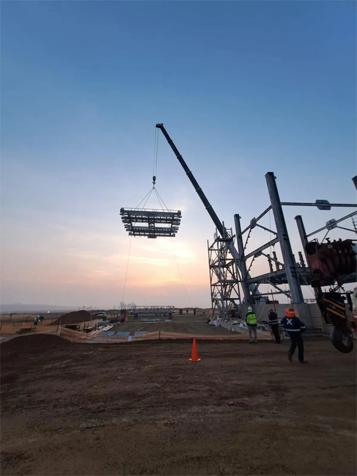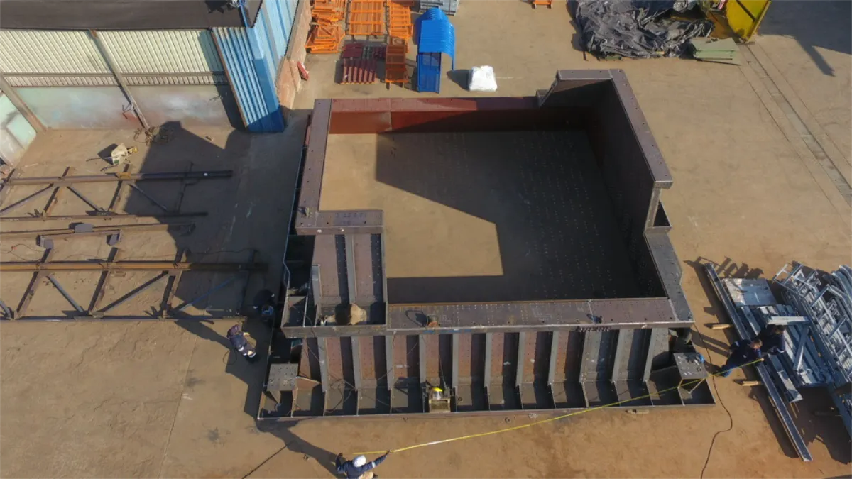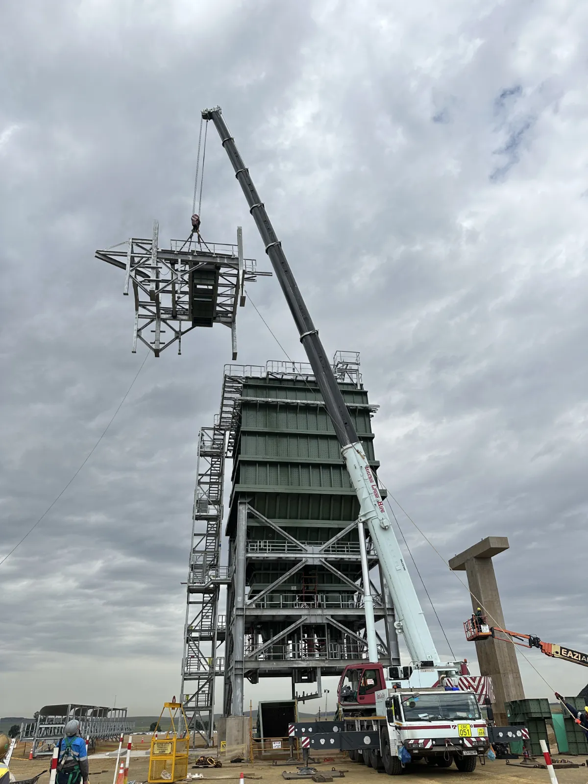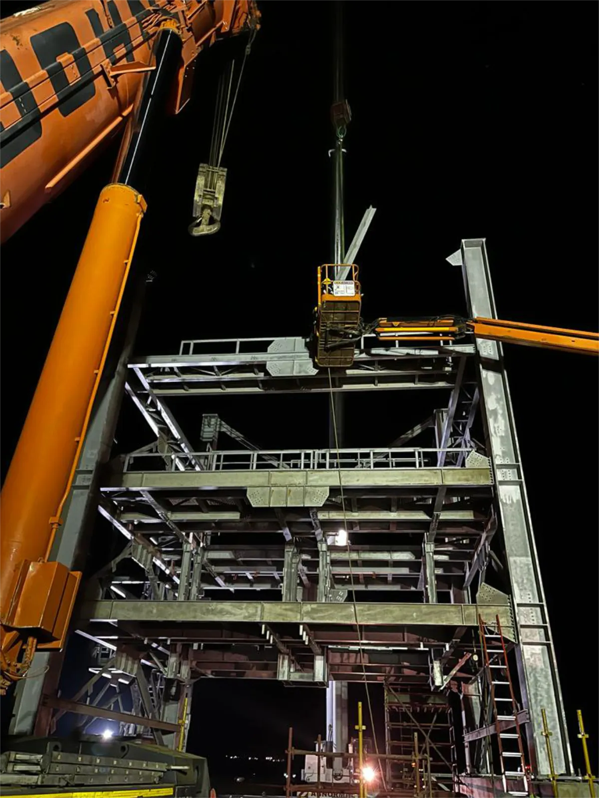 The radial gates and profile chutes of both truck loading bays are controlled by a single containerised hydraulic powerpack, located at ground level next to the LOS structure. The hydraulic powerpack is designed to ensure that the two loading bays can operate independently from each other. The speed of the actuators remains consistent regardless of any overlap in the duty cycle between the two loading bays - this is essential to ensure a consistent loading performance. The powerpack is equipped with accumulators that provide for the automatic closure of the radial gates and lifting of the profile chutes in the event of a power failure or hydraulic system failure. The truck loadout station consists of a reinforced concrete foundation with reinforced concrete stub columns linked with a R.C. Wall in the directions of truck travel below the bin. Above the truck occupied zone the bin consists of a structural steel frame up to the underside of the bin. The bin consists of structural steel platework stiffened with H-columns in the corners.