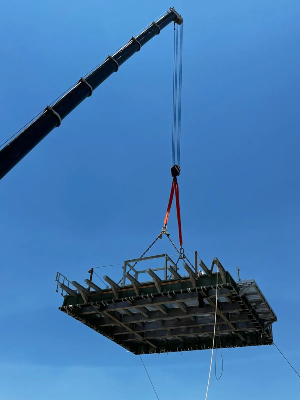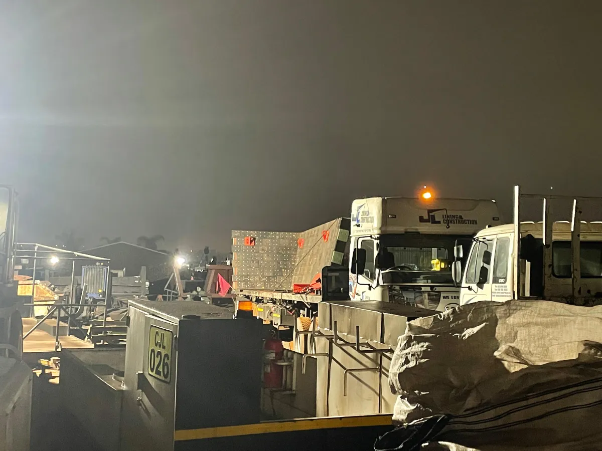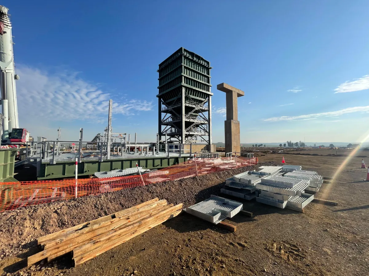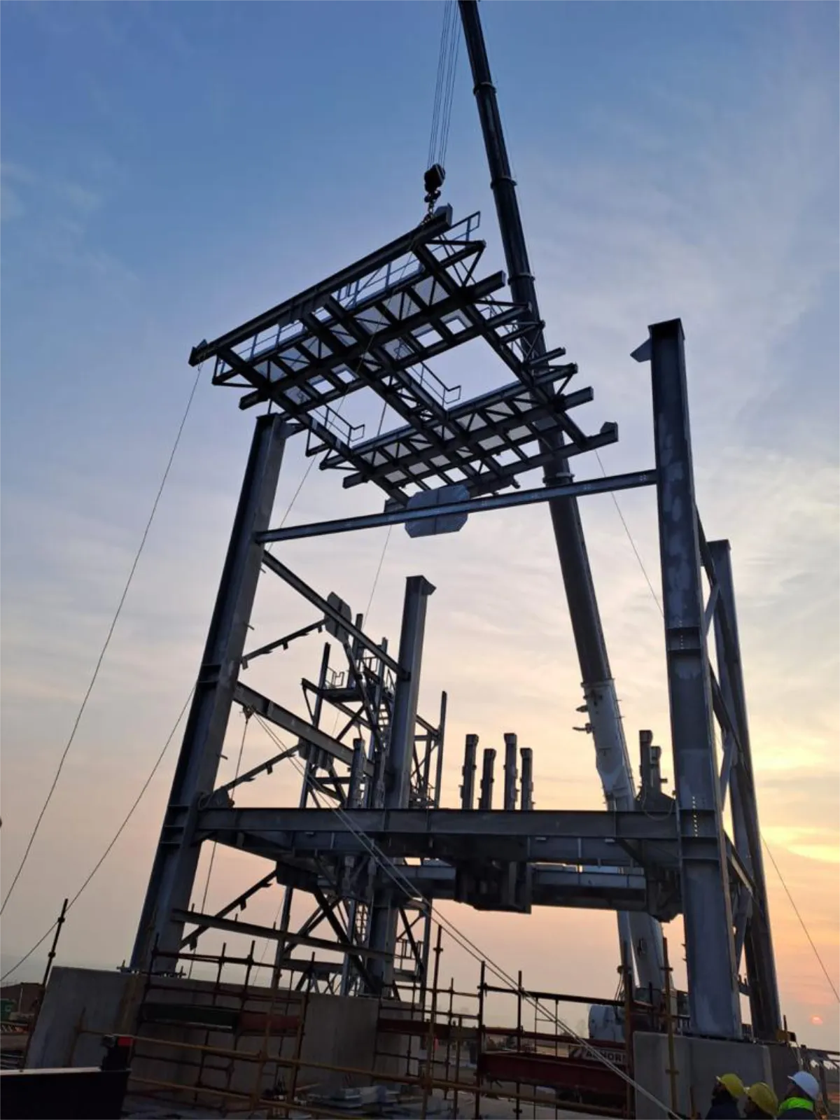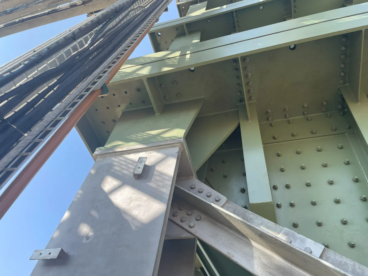 The radial gates and profile chutes of both truck loading bays are controlled by a single containerised hydraulic powerpack, located at ground level next to the LOS structure. The hydraulic powerpack is designed to ensure that the two loading bays can operate independently from each other. The speed of the actuators remains consistent regardless of any overlap in the duty cycle between the two loading bays - this is essential to ensure a consistent loading performance. The powerpack is equipped with accumulators that provide for the automatic closure of the radial gates and lifting of the profile chutes in the event of a power failure or hydraulic system failure. The truck loadout station consists of a reinforced concrete foundation with reinforced concrete stub columns linked with a R.C. Wall in the directions of truck travel below the bin. Above the truck occupied zone the bin consists of a structural steel frame up to the underside of the bin. The bin consists of structural steel platework stiffened with H-columns in the corners.