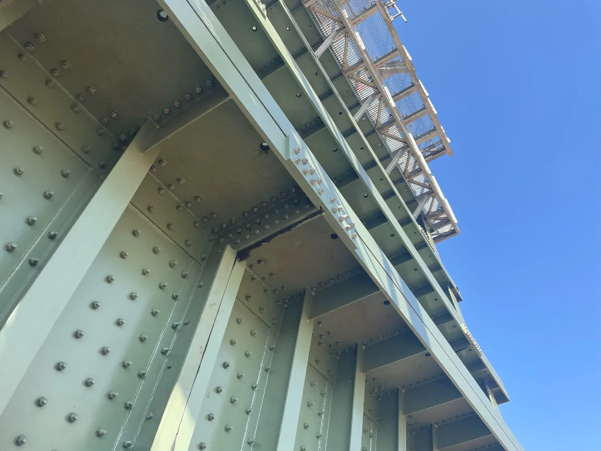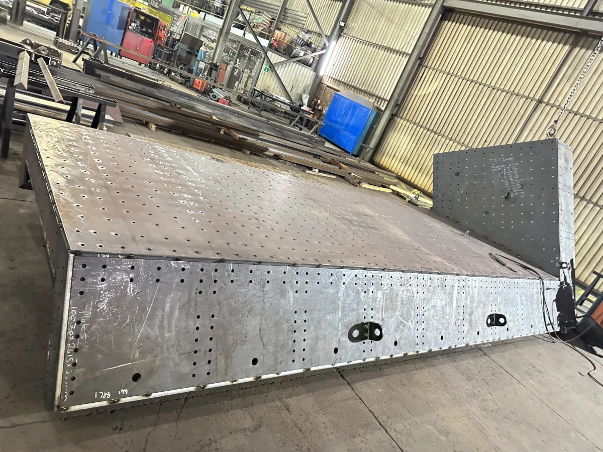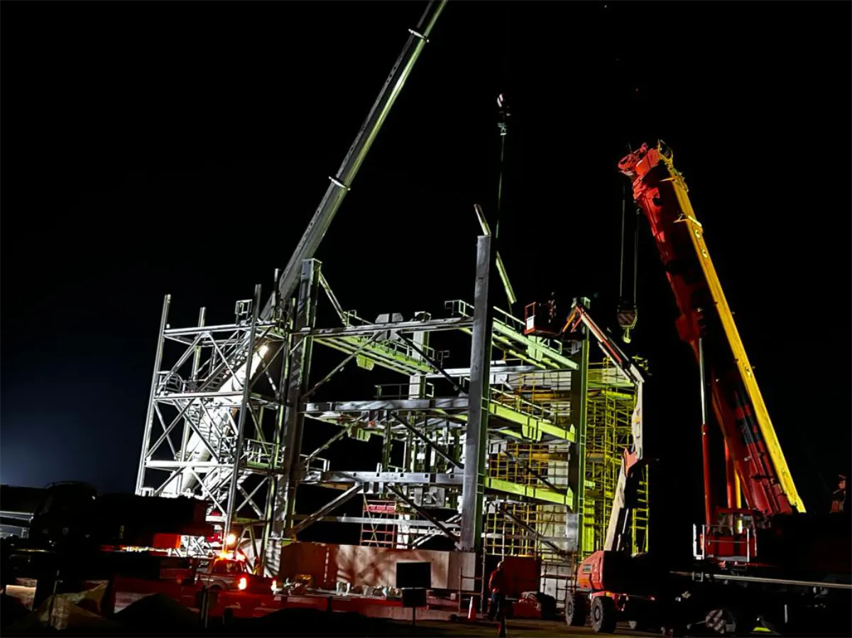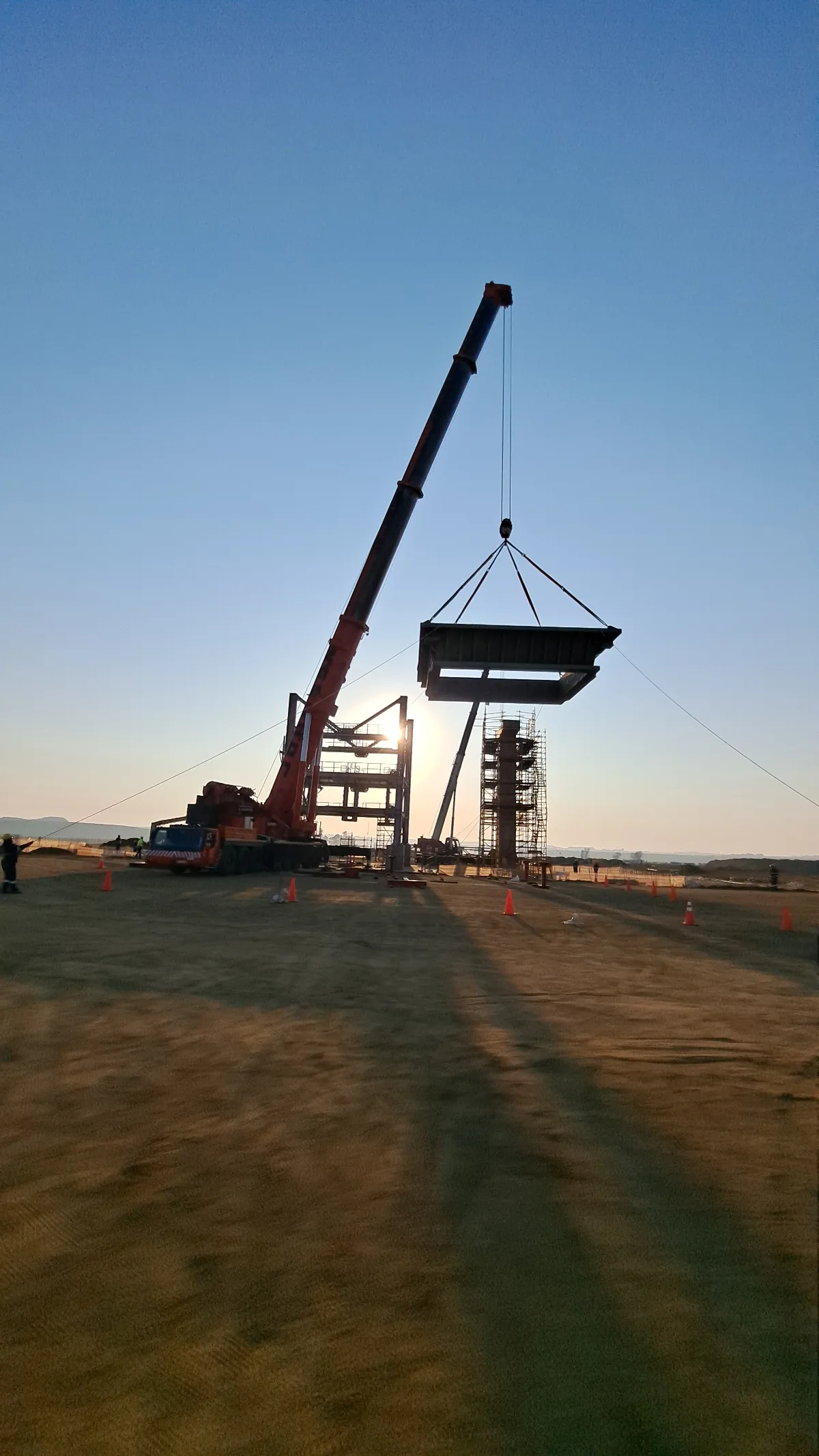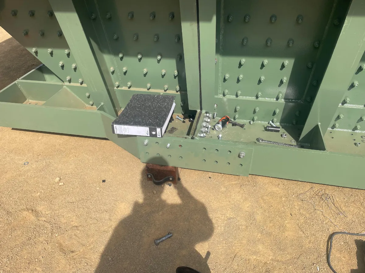 The radial gates and profile chutes of both truck loading bays are controlled by a single containerised hydraulic powerpack, located at ground level next to the LOS structure. The hydraulic powerpack is designed to ensure that the two loading bays can operate independently from each other. The speed of the actuators remains consistent regardless of any overlap in the duty cycle between the two loading bays - this is essential to ensure a consistent loading performance. The powerpack is equipped with accumulators that provide for the automatic closure of the radial gates and lifting of the profile chutes in the event of a power failure or hydraulic system failure. The truck loadout station consists of a reinforced concrete foundation with reinforced concrete stub columns linked with a R.C. Wall in the directions of truck travel below the bin. Above the truck occupied zone the bin consists of a structural steel frame up to the underside of the bin. The bin consists of structural steel platework stiffened with H-columns in the corners.