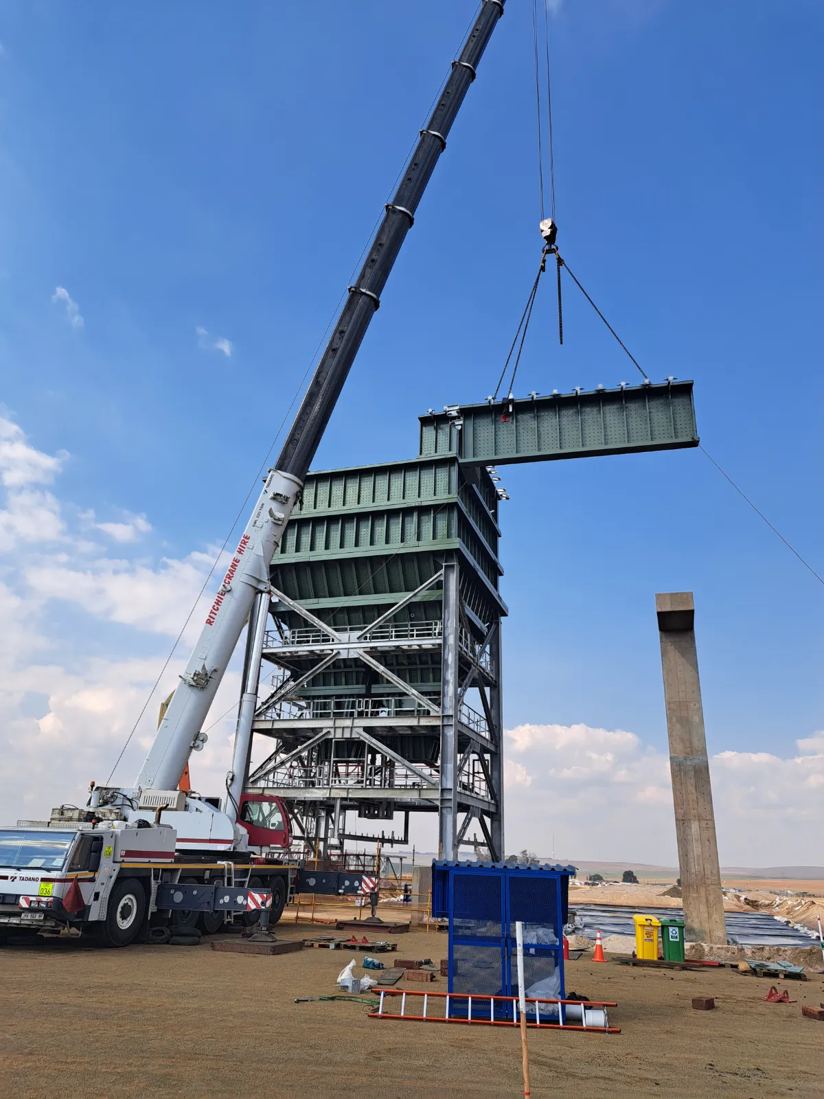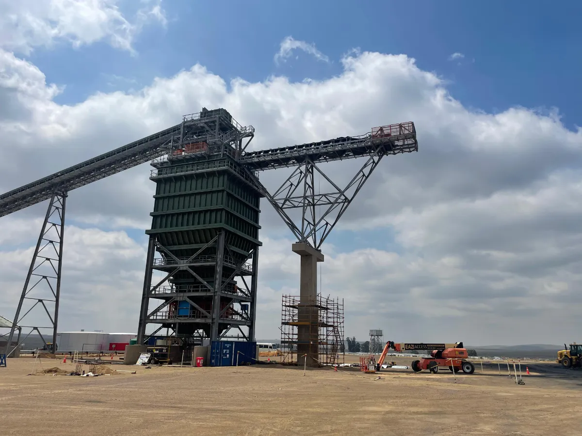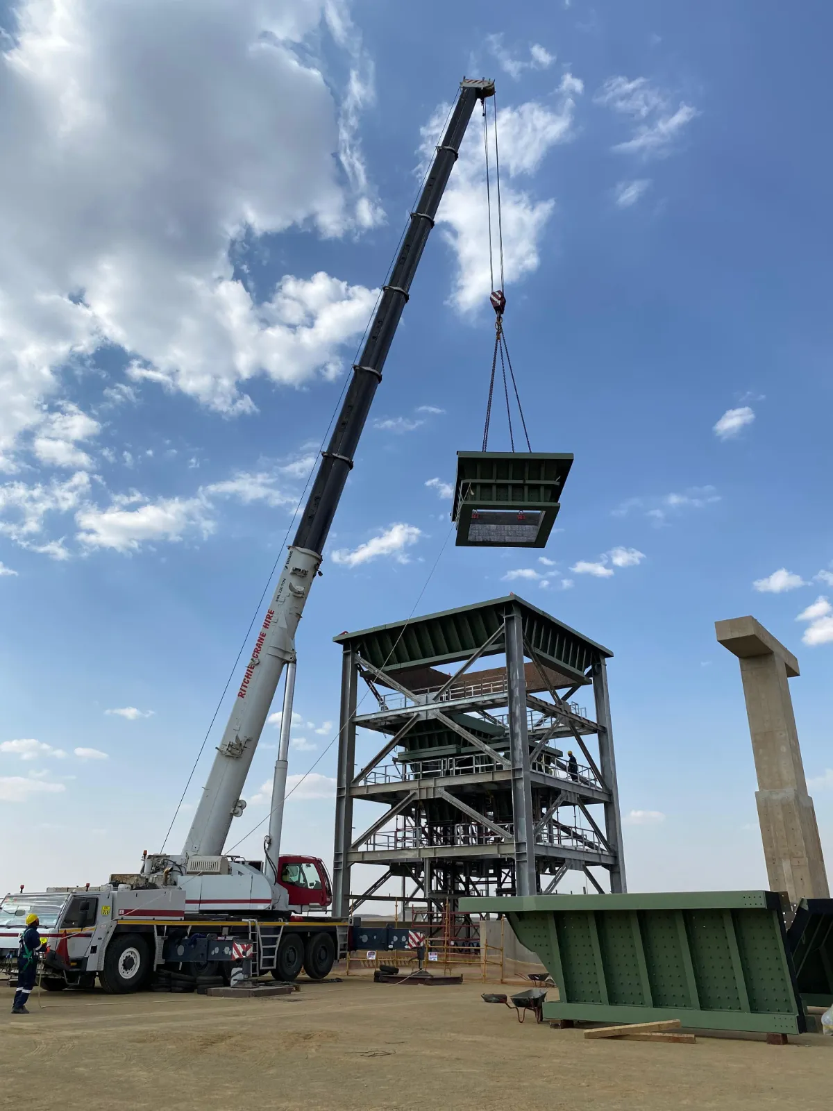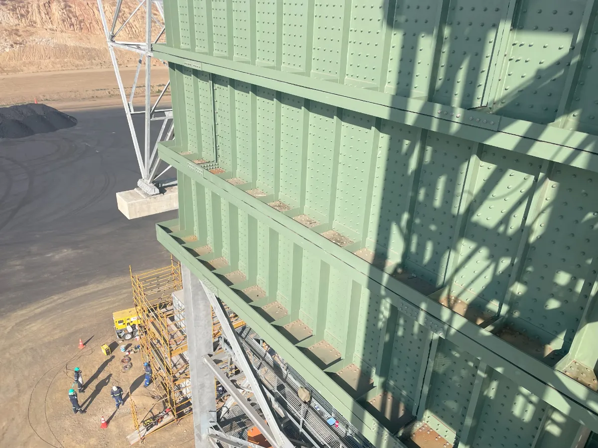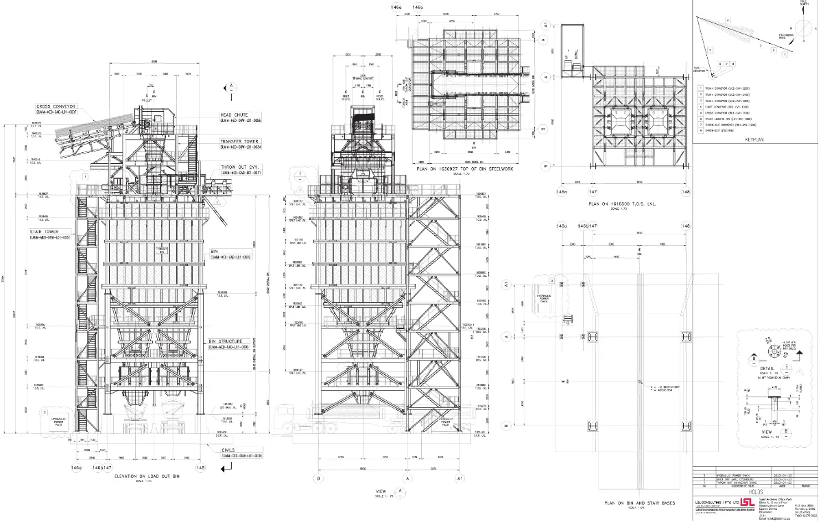 Suspended below the bin are two hydraulically operated flow control radial gates and two vertically adjustable profile loading chutes. As the trucks pass below the bin in the one direction bracing could not be provided in that direction for the lower level. At this location a portal frame was provided. Apart from this portal frame all levels are braced in all directions. On top of the bin there is a structure that supports the head and diverter chutes. This structure has a portal frame in the direction of the conveyor at the top of bin level, apart from this the structure is braced in all directions. The bin supports in incoming conveyor as well as the stockpile conveyor.