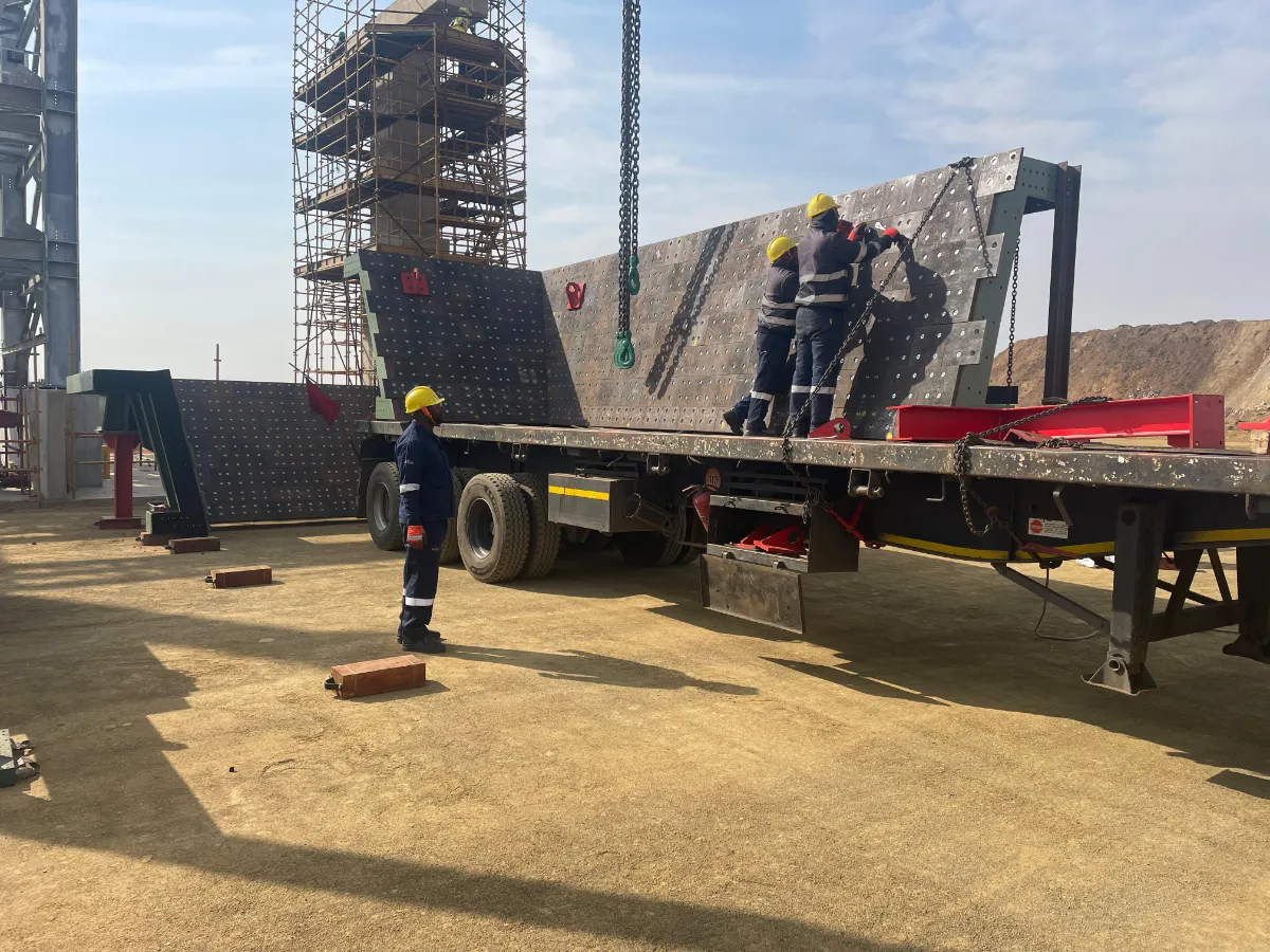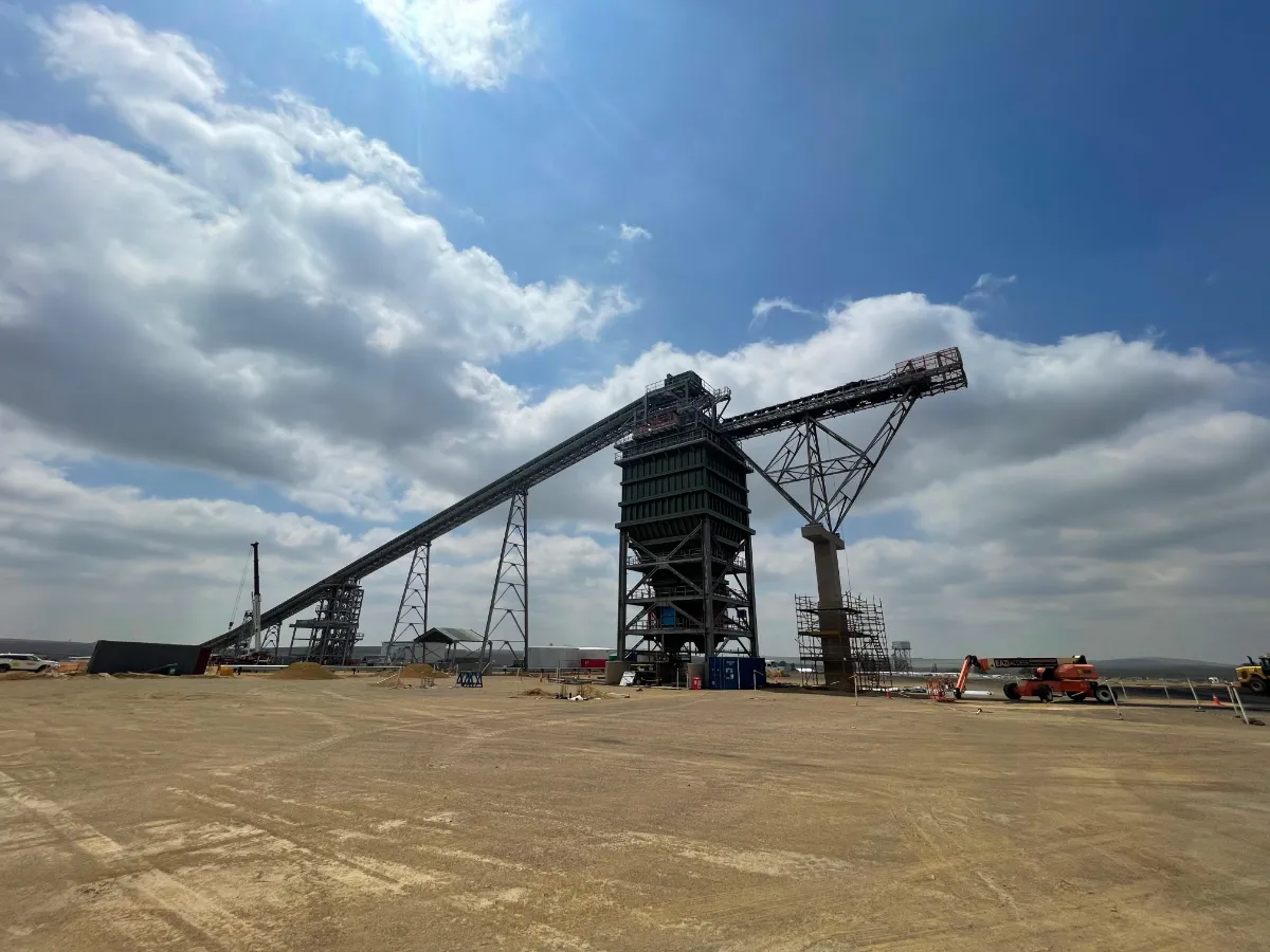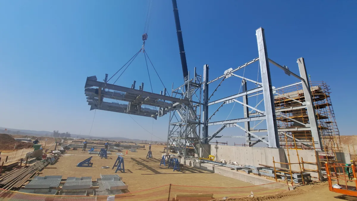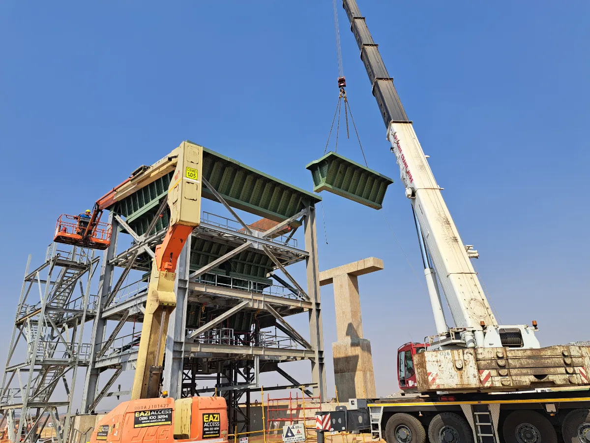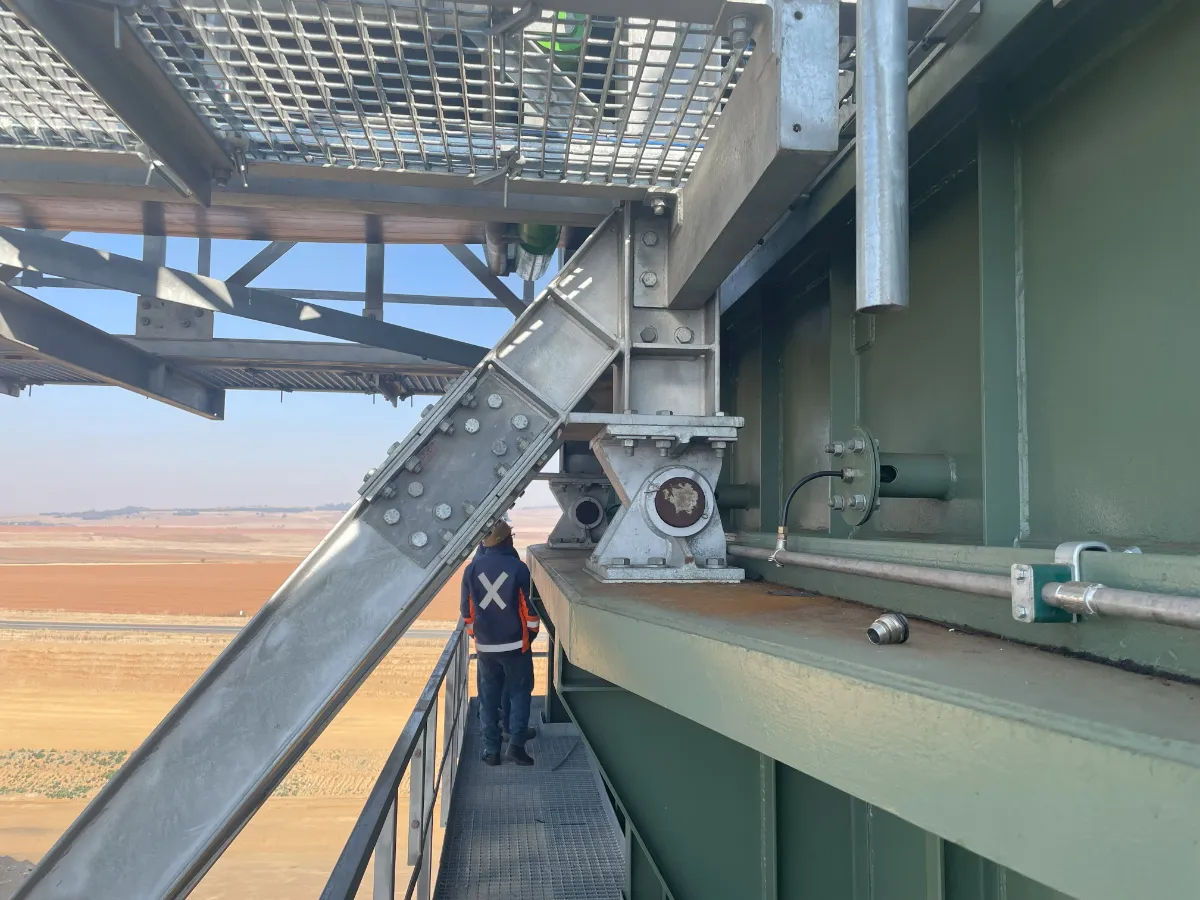 Suspended below the bin are two hydraulically operated flow control radial gates and two vertically adjustable profile loading chutes. As the trucks pass below the bin in the one direction bracing could not be provided in that direction for the lower level. At this location a portal frame was provided. Apart from this portal frame all levels are braced in all directions. On top of the bin there is a structure that supports the head and diverter chutes. This structure has a portal frame in the direction of the conveyor at the top of bin level, apart from this the structure is braced in all directions. The bin supports in incoming conveyor as well as the stockpile conveyor.