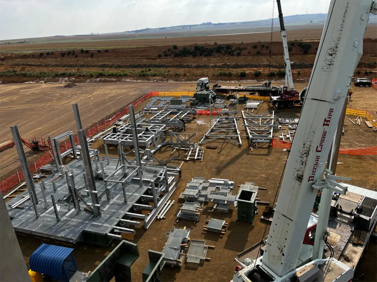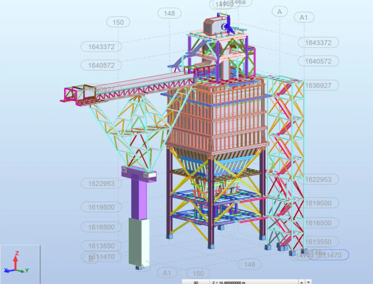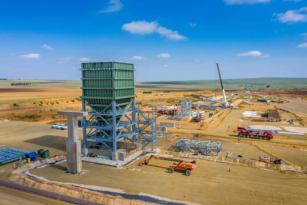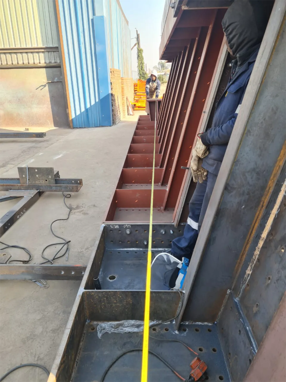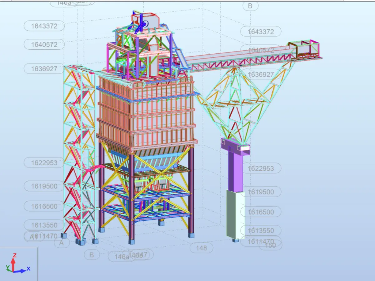 Suspended below the bin are two hydraulically operated flow control radial gates and two vertically adjustable profile loading chutes. As the trucks pass below the bin in the one direction bracing could not be provided in that direction for the lower level. At this location a portal frame was provided. Apart from this portal frame all levels are braced in all directions. On top of the bin there is a structure that supports the head and diverter chutes. This structure has a portal frame in the direction of the conveyor at the top of bin level, apart from this the structure is braced in all directions. The bin supports in incoming conveyor as well as the stockpile conveyor.