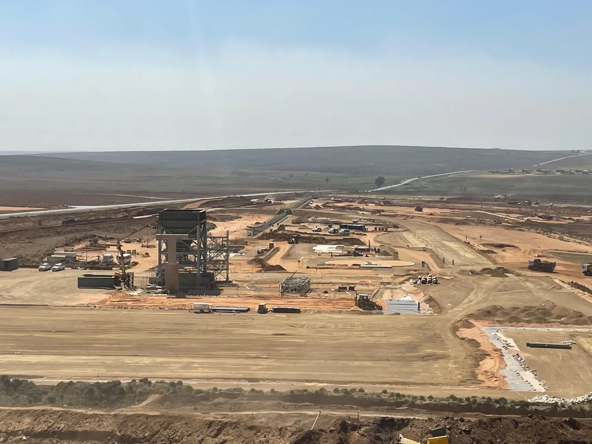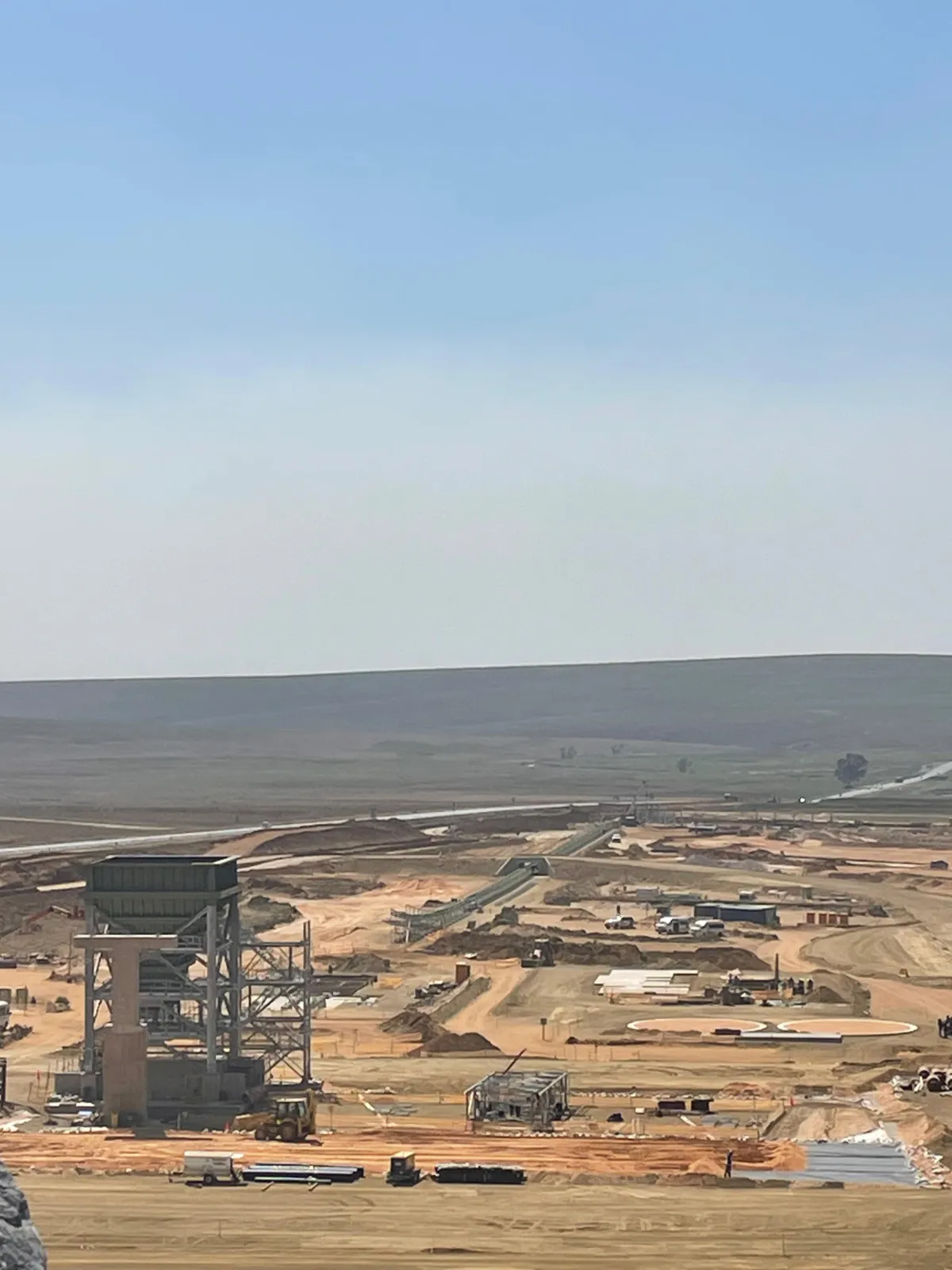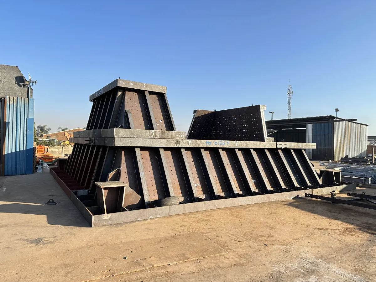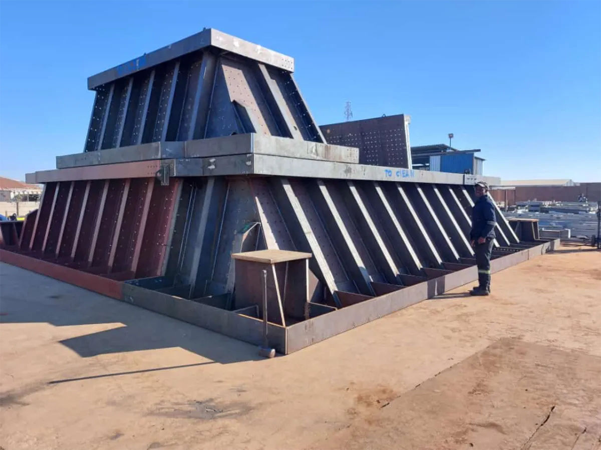 Suspended below the bin are two hydraulically operated flow control radial gates and two vertically adjustable profile loading chutes. As the trucks pass below the bin in the one direction bracing could not be provided in that direction for the lower level. At this location a portal frame was provided. Apart from this portal frame all levels are braced in all directions. On top of the bin there is a structure that supports the head and diverter chutes. This structure has a portal frame in the direction of the conveyor at the top of bin level, apart from this the structure is braced in all directions. The bin supports in incoming conveyor as well as the stockpile conveyor.