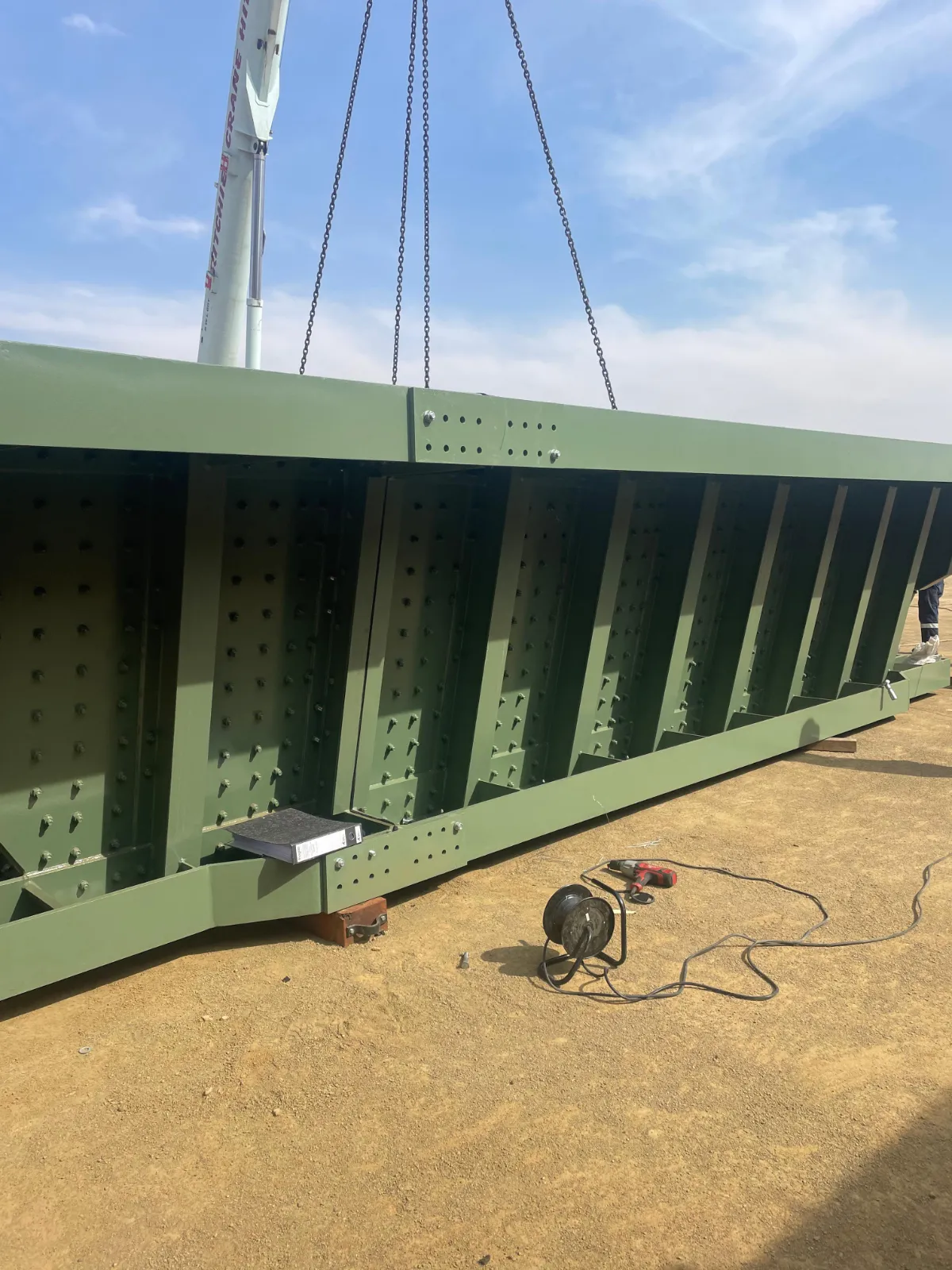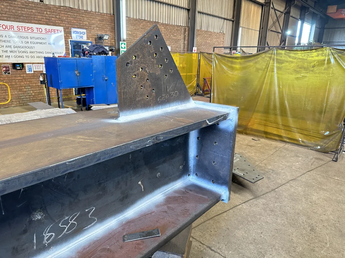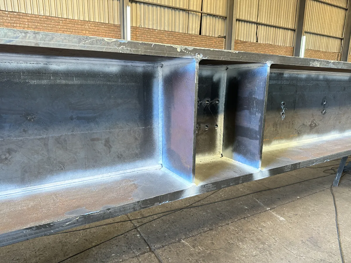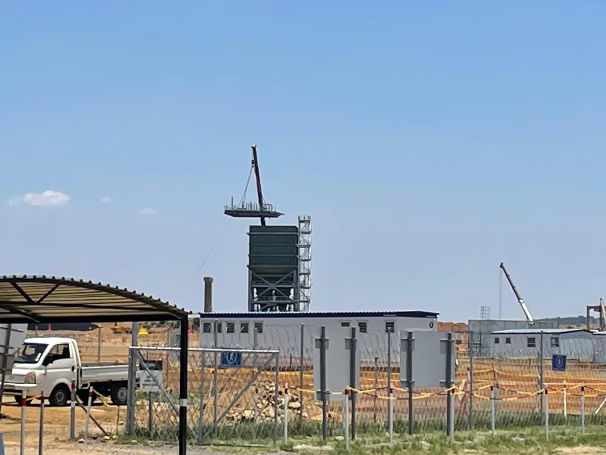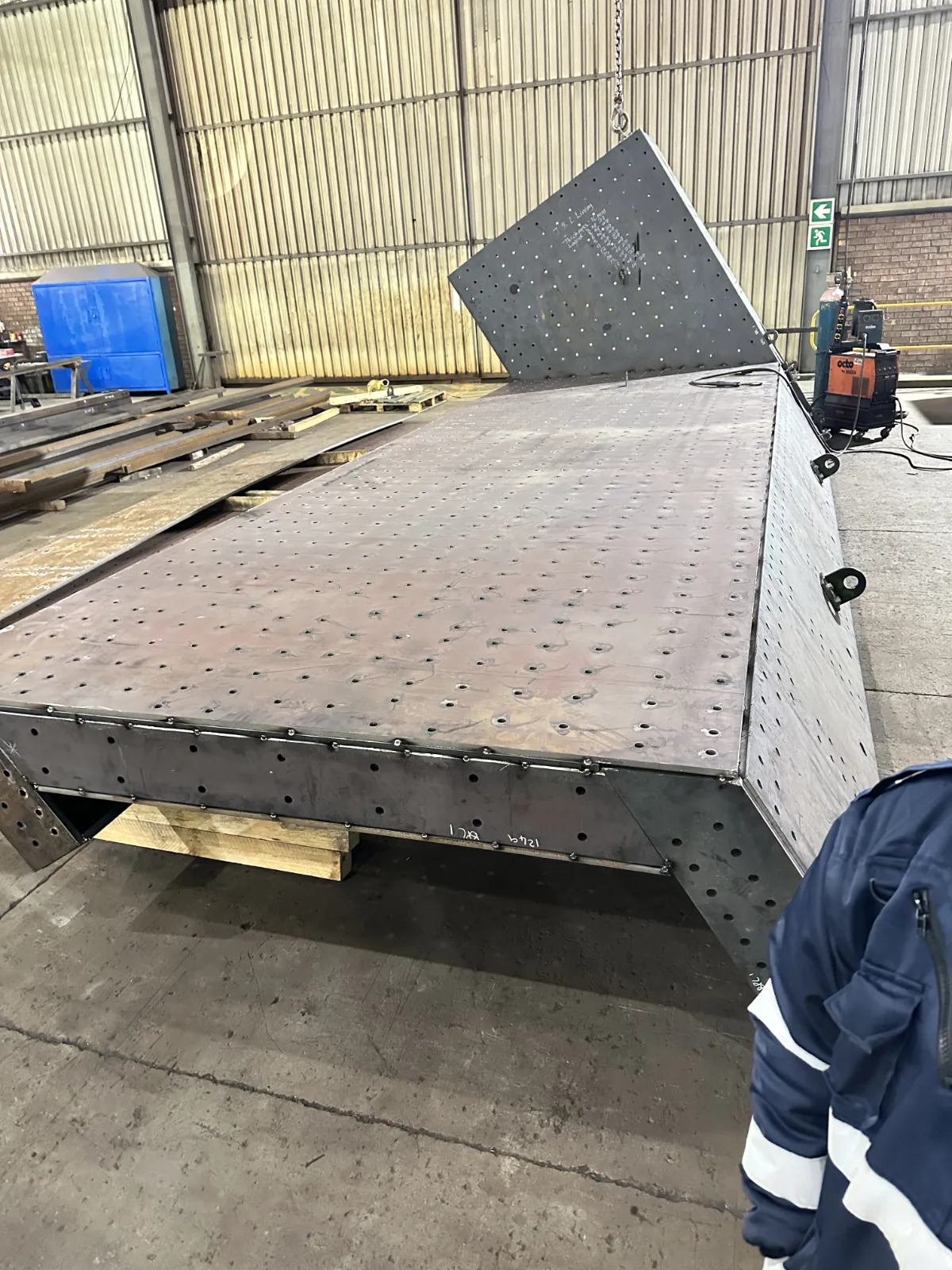 Suspended below the bin are two hydraulically operated flow control radial gates and two vertically adjustable profile loading chutes. As the trucks pass below the bin in the one direction bracing could not be provided in that direction for the lower level. At this location a portal frame was provided. Apart from this portal frame all levels are braced in all directions. On top of the bin there is a structure that supports the head and diverter chutes. This structure has a portal frame in the direction of the conveyor at the top of bin level, apart from this the structure is braced in all directions. The bin supports in incoming conveyor as well as the stockpile conveyor.