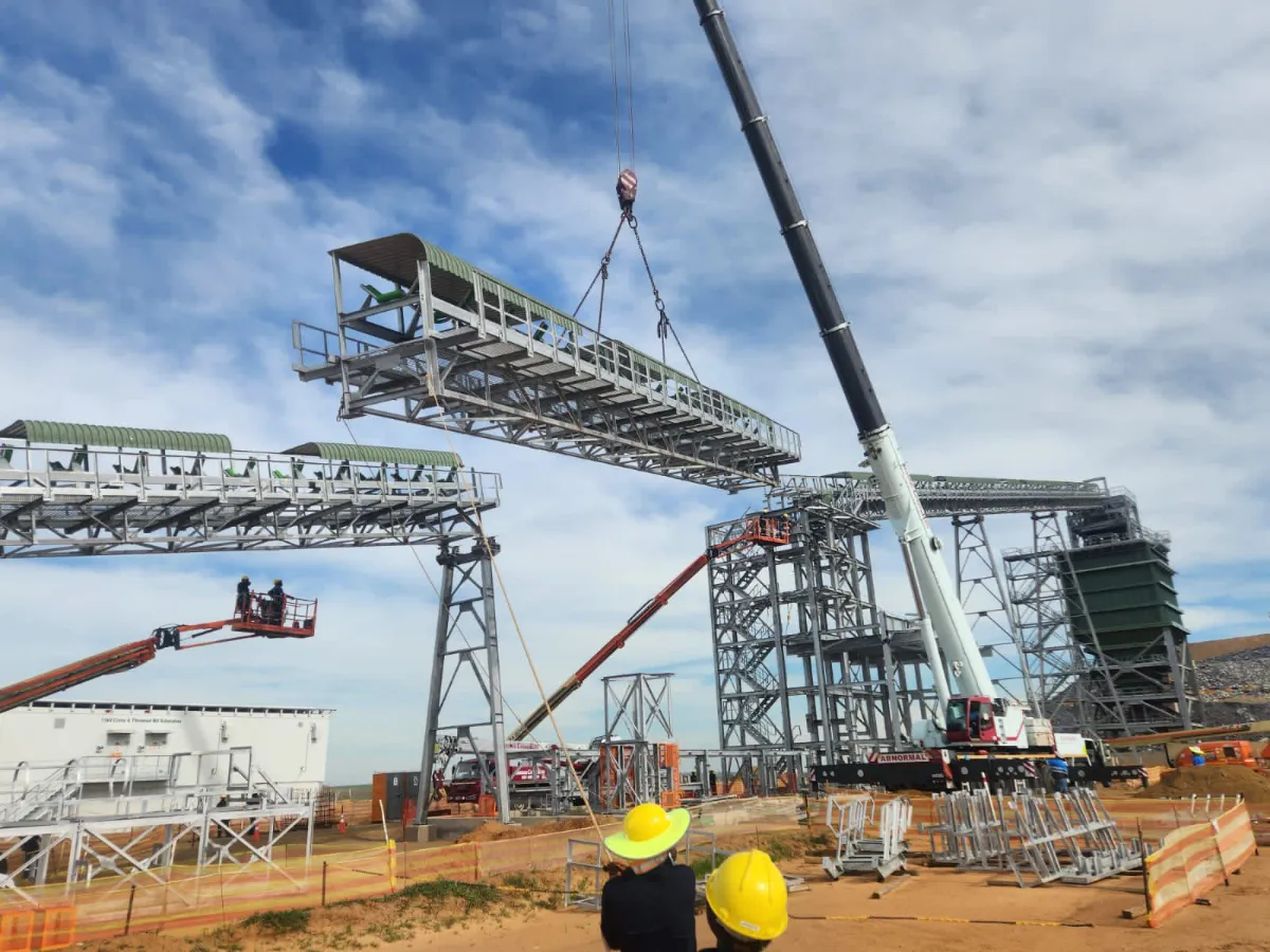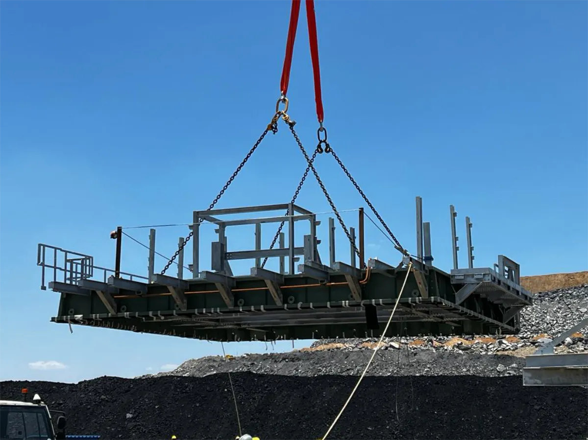 The Elders truck loading station is designed to profile load -250mm ROM coal into either 40 ton or 50 ton payload side tipping tandem interlink trucks via two parallel truck loading bays. Trucks can be loaded and dispatched at a rate of 34trucks/hour. Truck payloads are verified at road weigh bridges prior to despatch from Elders. A Throw-Out Conveyor installed on top of the truck loading station allows excess product to be diverted to a conical stockpile when the truck loading station surge bin is full.